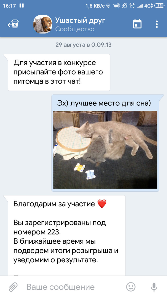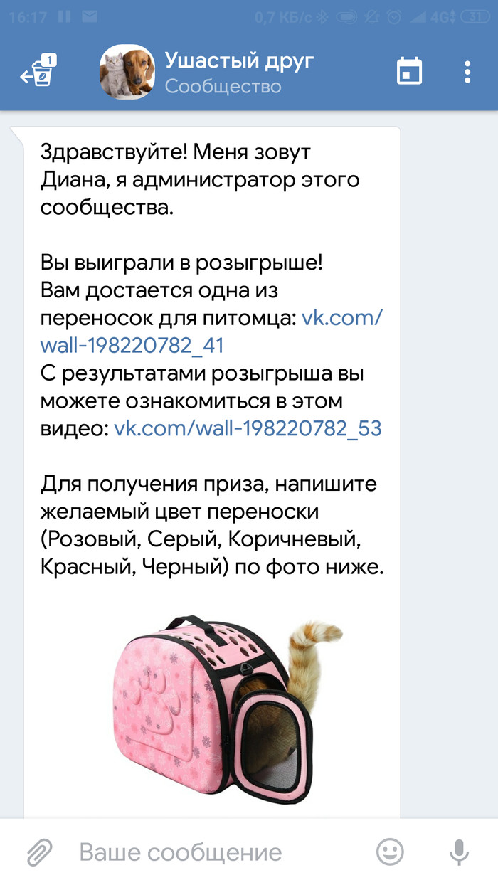 Как то вечером в ВК мне вылетела реклама розыгрыша переноски для животных. У меня две кошки и лишняя переноска всегда кстати. Для участия в конкурсе нужно было отправить фото своего питомца после вам присваивается номер и вы ждёте розыгрыша . Собственно вот группа.