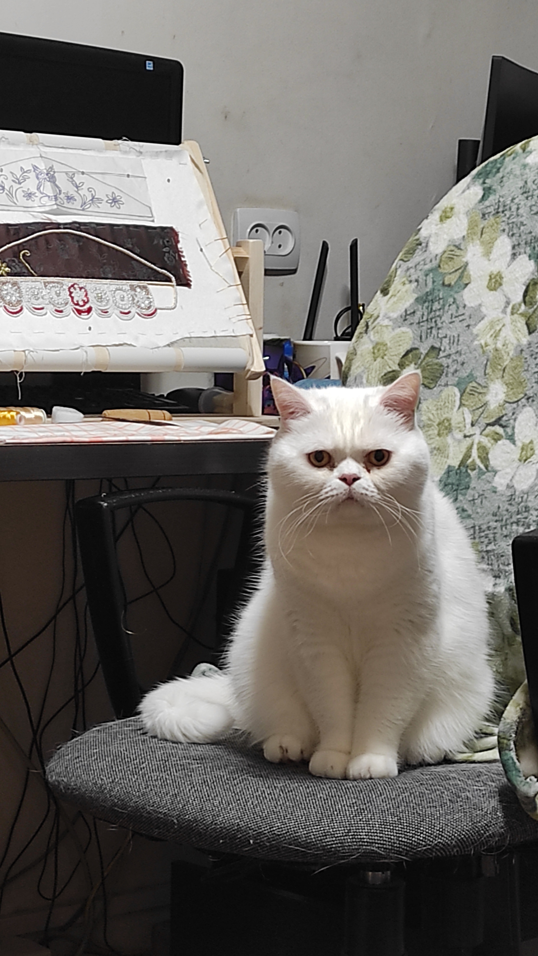 Как только ставлю пяльцы - кот сразу под них и так лежит пока не уберу.