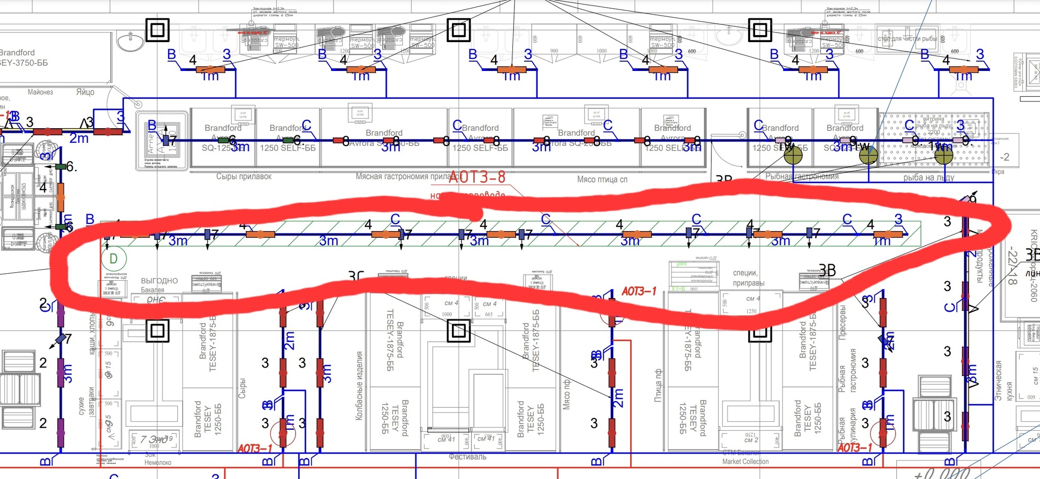 Также как и зону кассовой линии и рыбу вместе с икроным холодильником.