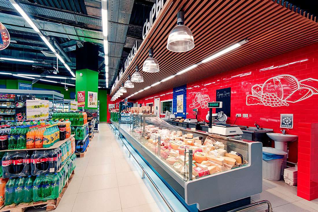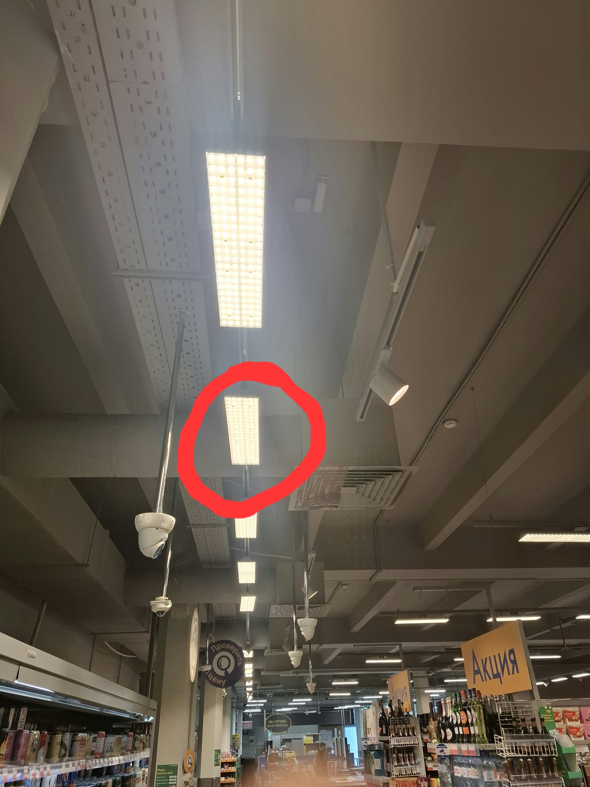 Впереди отдел с мясом, рыбой, кулинарией. У каждого отдела свое освещение. Задача этой линии осветить только проходы и торцевые стелажи сзади если они есть или будут. Зачастую сначала в магазине делают ремонтные работы, а уже потом перестановку.