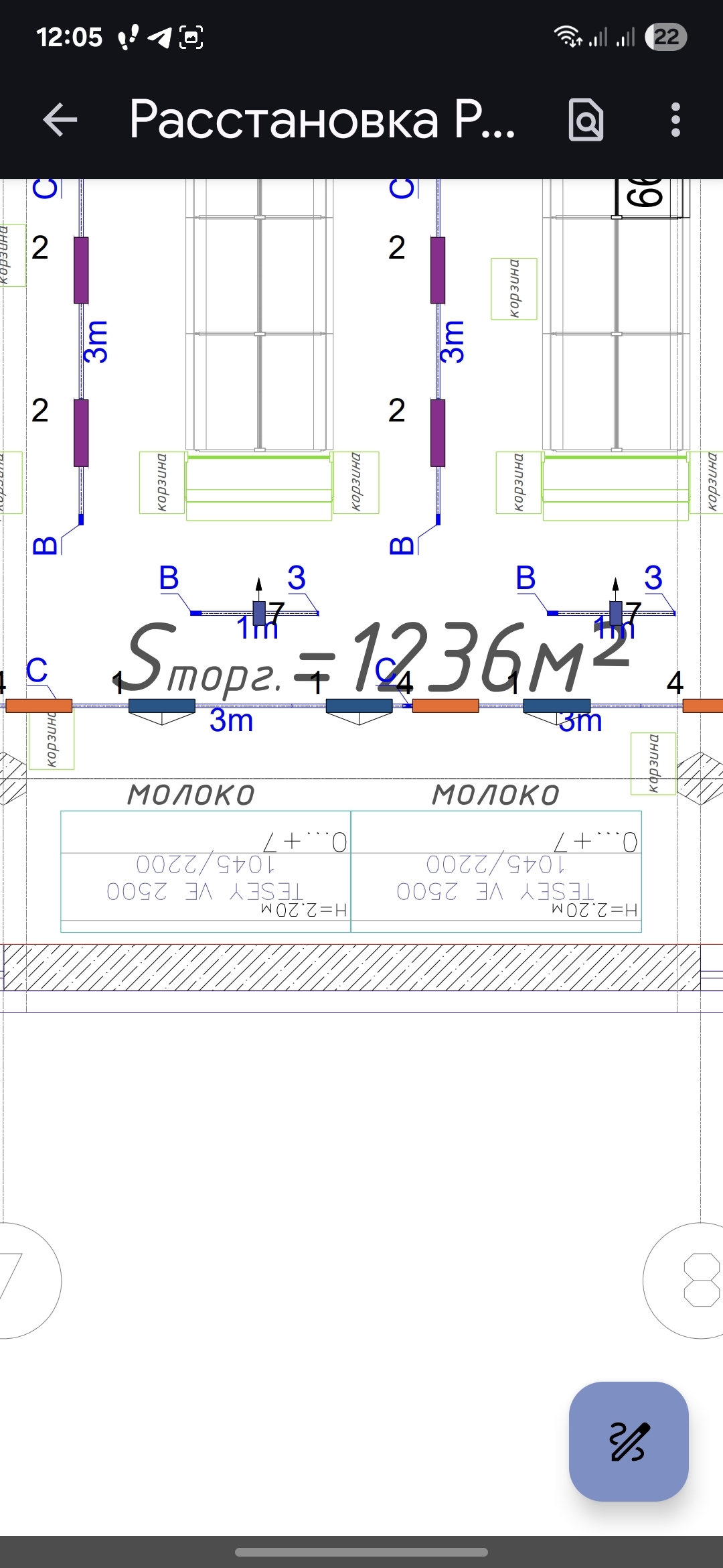 Синие прямоугольники со стрелкой обозначенные цифрой 1 это односторонние асиметрики, светят только в сторону холодильников с молоком. Освещением торцевых стелажей занимаются малькие синие квадраты под цифрой 7.(То самое акцентное освещение мы до него ещё дойдем)