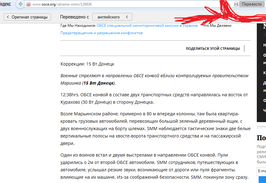("Военные стреляют в направлении ОБСЕ конвой вблизи контролируемых правительством Мариинка (15 Вт Донецк).