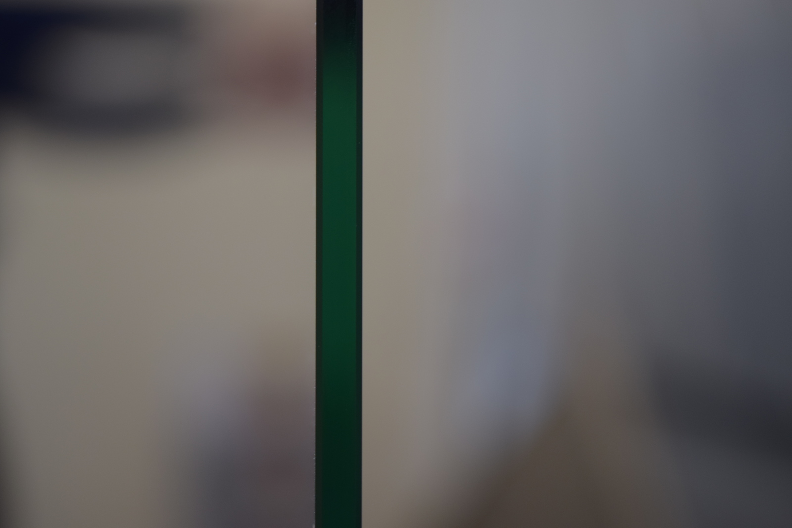 "На маленьких образцах даже не оптивайт, а флоат с прямой (не трапецевидной) кромкой, имеет прозрачный торец. Трапеция в отличие от прямого торца значительно меньше подвержена сколам, но эффект прозрачности торца также понижается. Чем больше полотно и угол зрения, тем, соответственно, бирюзовее торец на оптивайте."