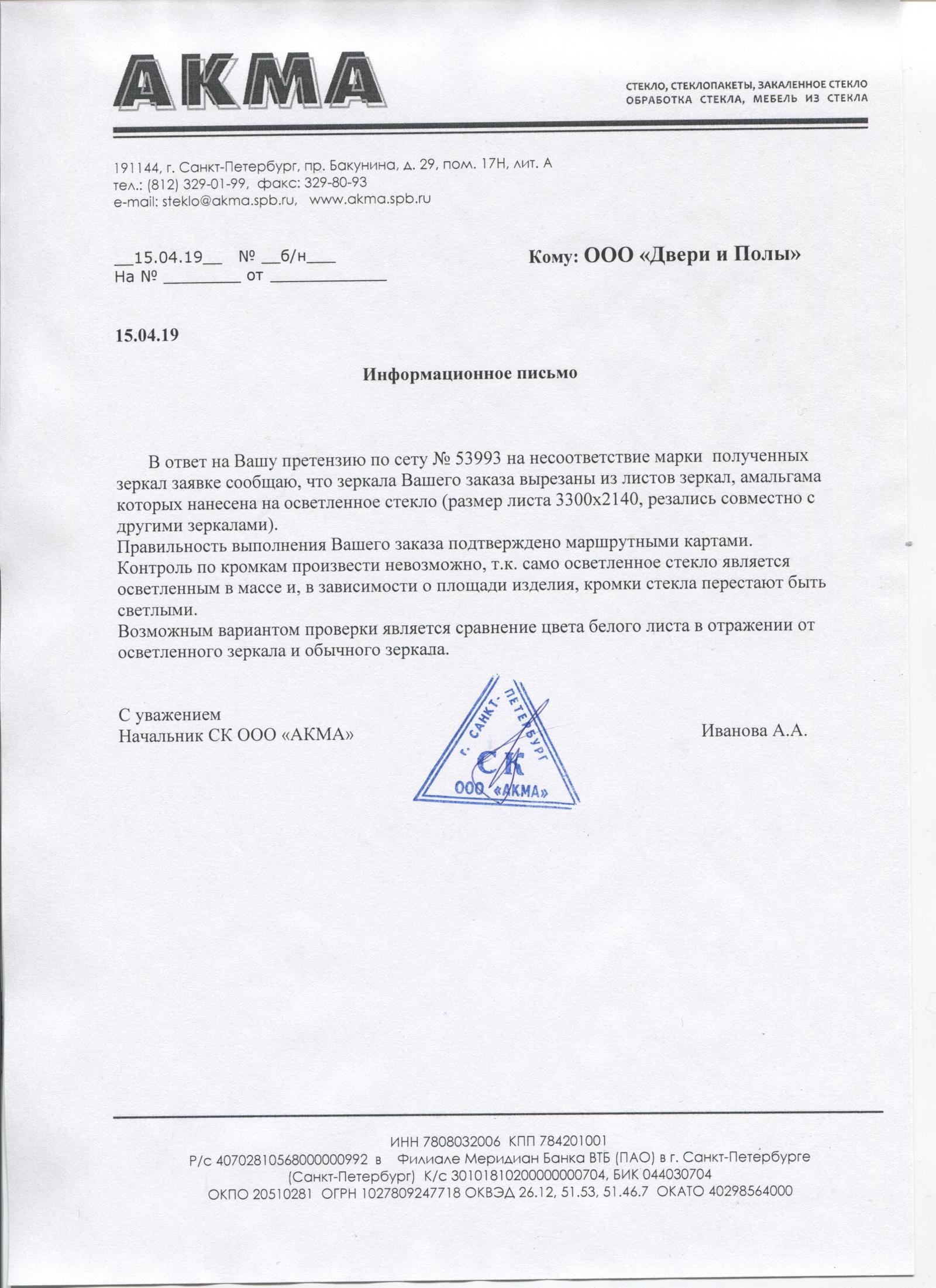 Попытка узнать истину №2 - отправил произвольную претензию, со ссылками на статьи закона о защите прав потребителей, про несоответствие заявленному качеству, про замену товара, про возможную экспертизу и оплату её продавцом, и предложил пожалуй самый простой вариант досудебного решения спора - пересчитать счет на оплату словно это самые обычные неосветленные зеркала.