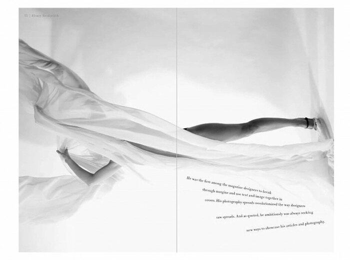 Также он начал делать фотографии не в студии, а на натуре, что было необычно для модного журнала. Надо заметить, что он при этом и сам был известным фотографом. Главный редактор Фрэнсис Макфадден вспоминала о нем так: «Было приятно наблюдать за его работой. Он был таким быстрым и уверенным. В чрезвычайных ситуациях, как в тот раз, когда Клипер с отчетом о парижских сборах был задержан на Бермудских островах, его скорость была потрясающей. Пара быстрых капель на разделочную доску, минутное жонглирование фотокопиями, мазок - и шестнадцать страниц были готовы. Его макеты, конечно, приводили в отчаяние копирайтеров, чьи заветные стихи о поясах или норках были принесены в жертву его священному белому пространству. Непосредственно перед тем, как мы отправились в печать, все макеты были разложены в определенной последовательности на полу у Кармел Сноу и там, под его присмотром, переставлялись до тех пор, пока ритм журнала ему не понравился».