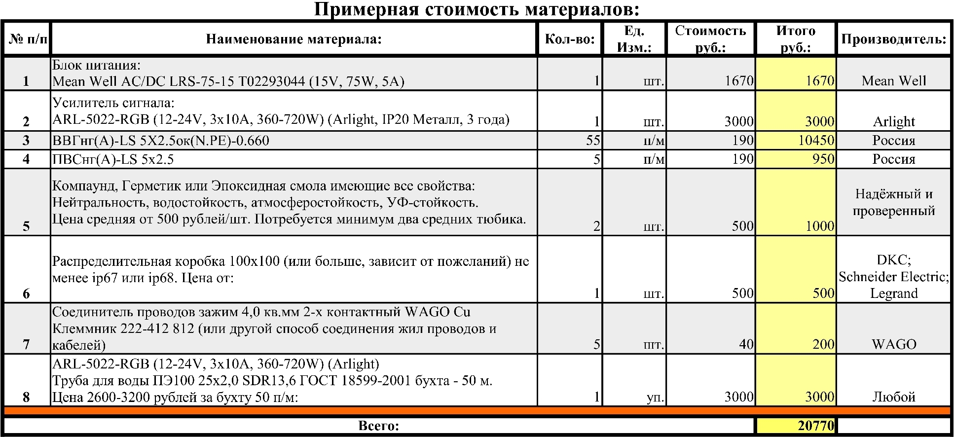 Чтобы управлять и питать 12V оборудование на таком расстоянии (траншея ~40м + укладка в неё ~2-3м + разводка по дому ~10-15м + сама RGB лента 5м/п), приходим к необходимости подбора кабеля нужного сечения для питания оборудования и кабеля для коммутации оборудования, блока усилителя сигнала RGB, блока питания усилителя сигнала RGB (ниже описано почему).