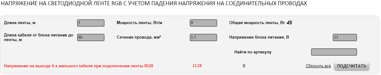 Для расчётов требуемого сечения кабеля и потерь на светодиодной ленте использовал online-калькулятор Arligh (Различные калькуляторы расчёта от компании Arligh).