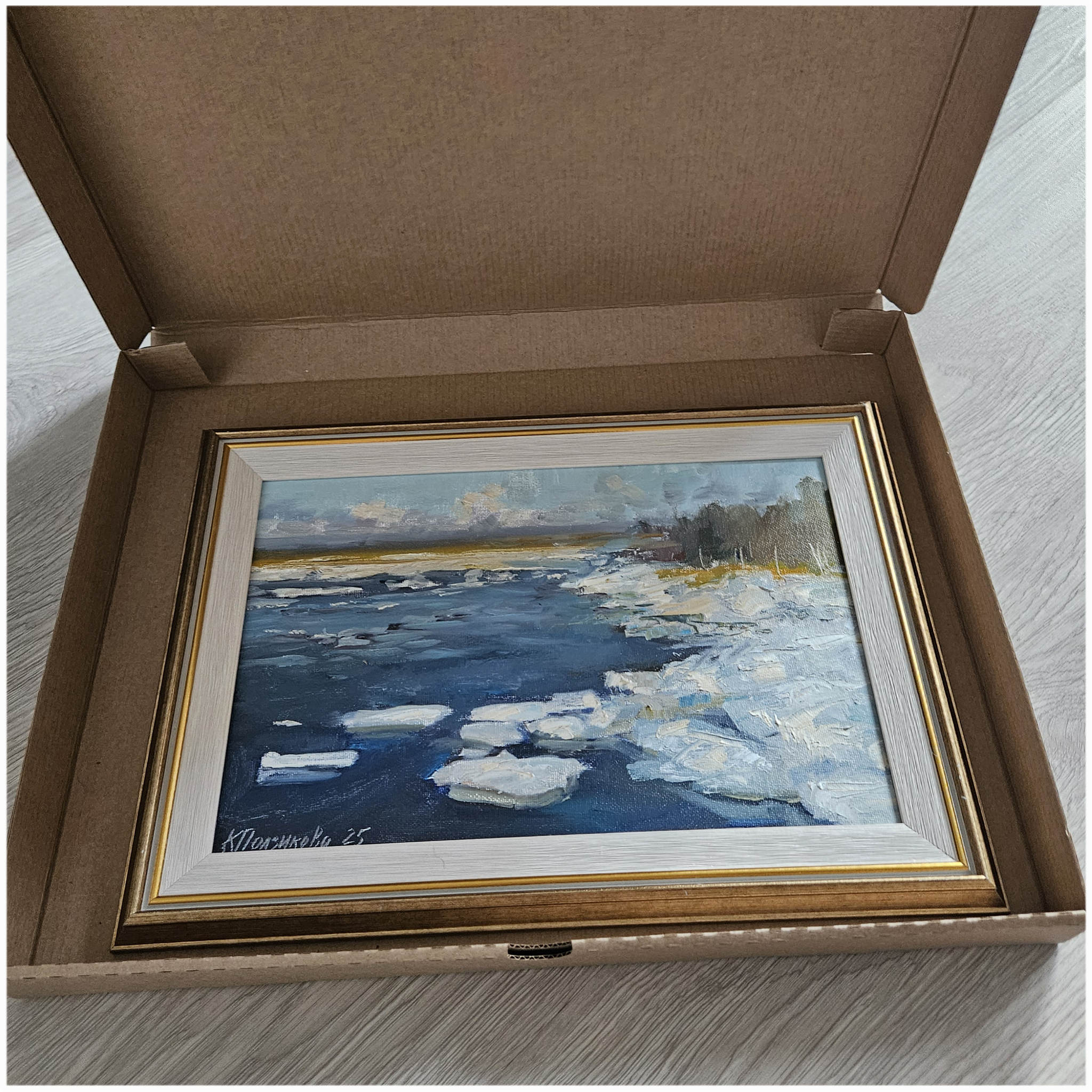 Иногда происходит так, что только выставила картину в галерее, она сразу находит своего нового владельца. Это прекрасный этюд, написанный совсем недавно, всего около двух недель назад. Ледоход всегда является захватывающим зрелищем. У меня сформировалась целая серия работ.