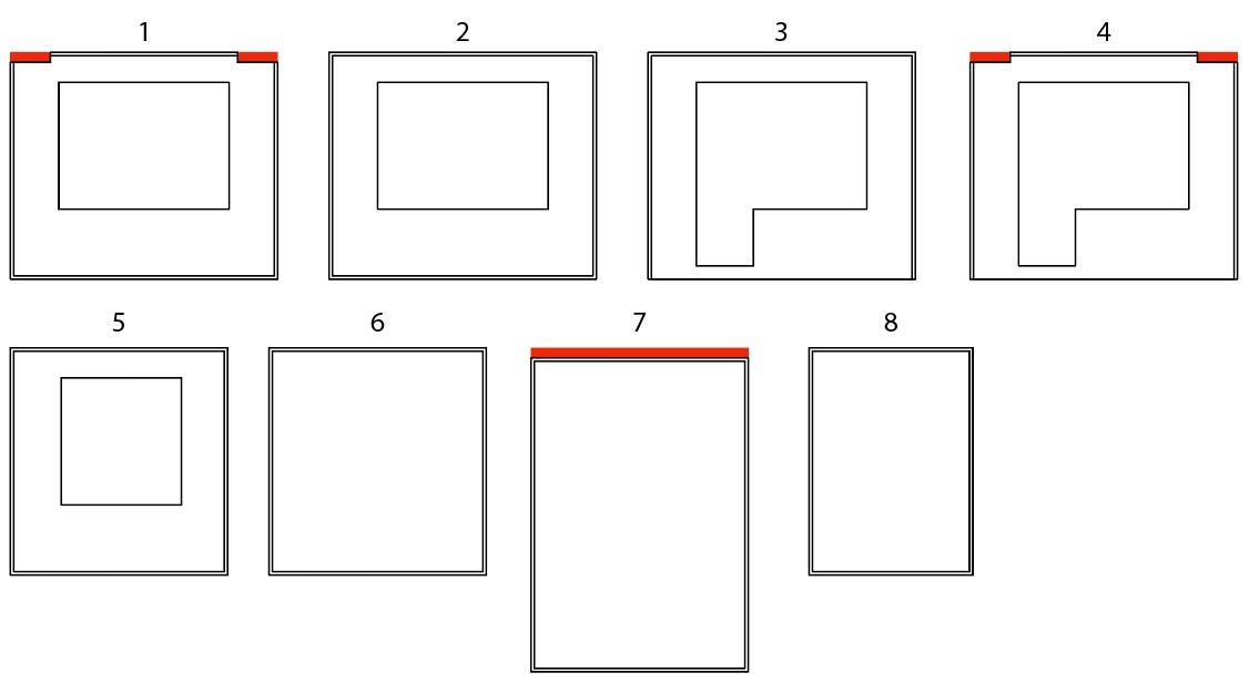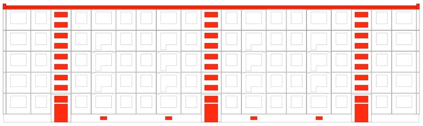 *1— широкое окно на первом этаже, 2 — широкое окно на 5 этаже, 3 — балконное окно на 4 этаже, 4 — балконное окно, 5 — обычное окно, 6 — окно лестничной клетки, 7 — плита с дверью подъезда, 8 — торцевая плита. Красным показаны вырезы в плитах под балконы(1, 4) или крышу подъезда(7)