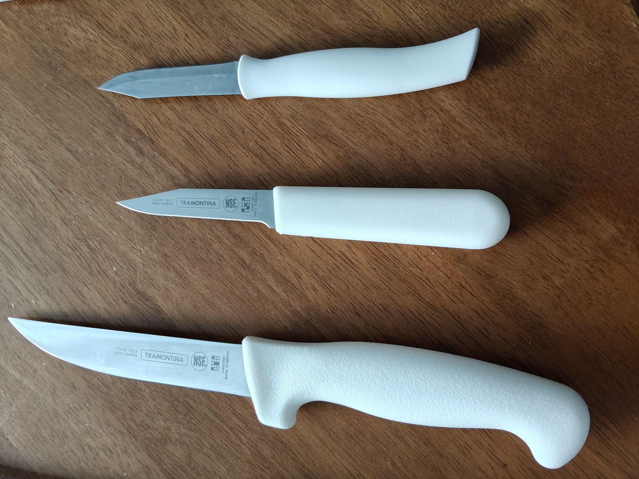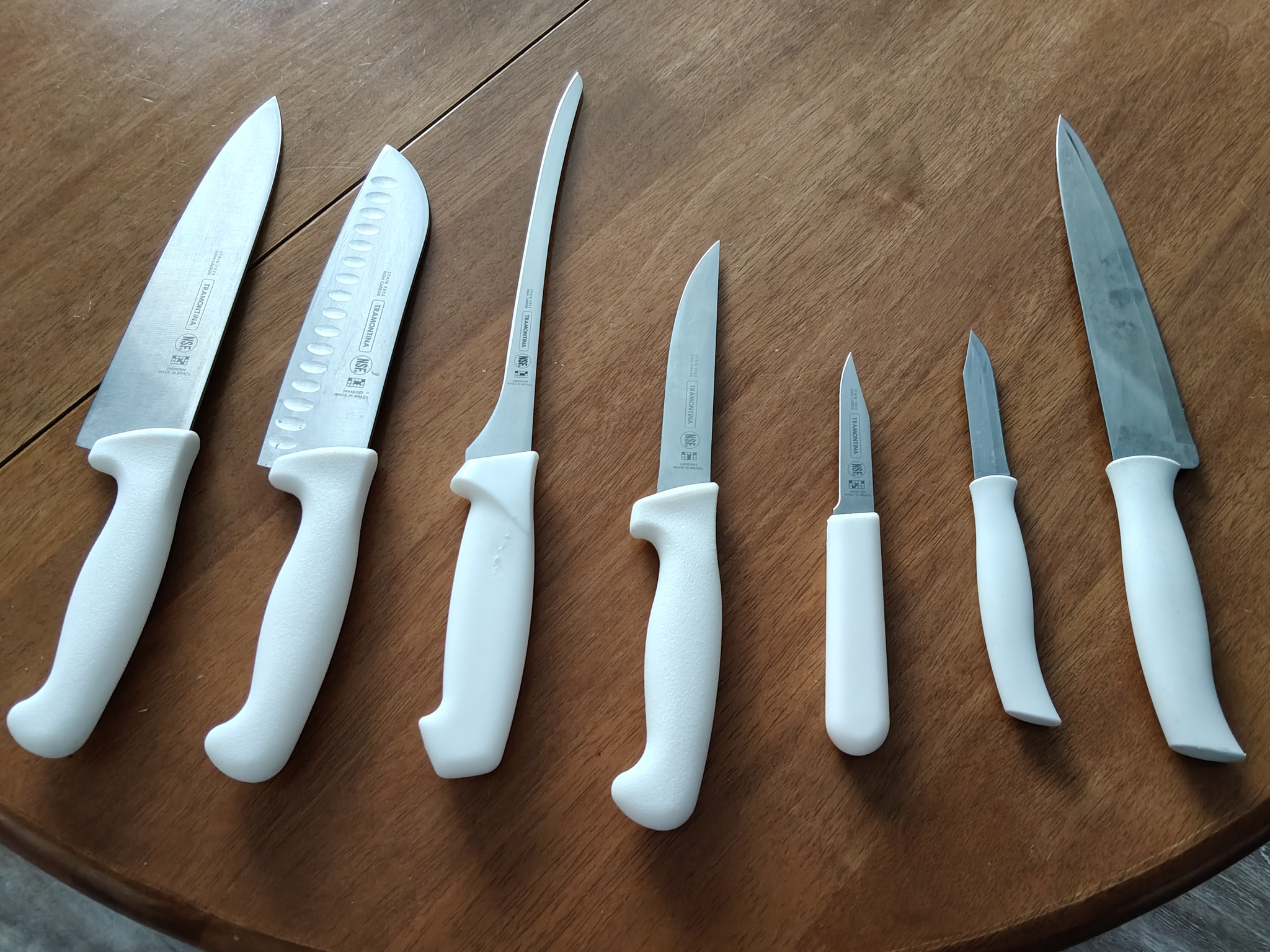 Tramontina PRO-серии - просто топ! Стоит разумных денег, хорошо держит заточку, не выкрашивается, элементарно точится, отлично правится мусатом.