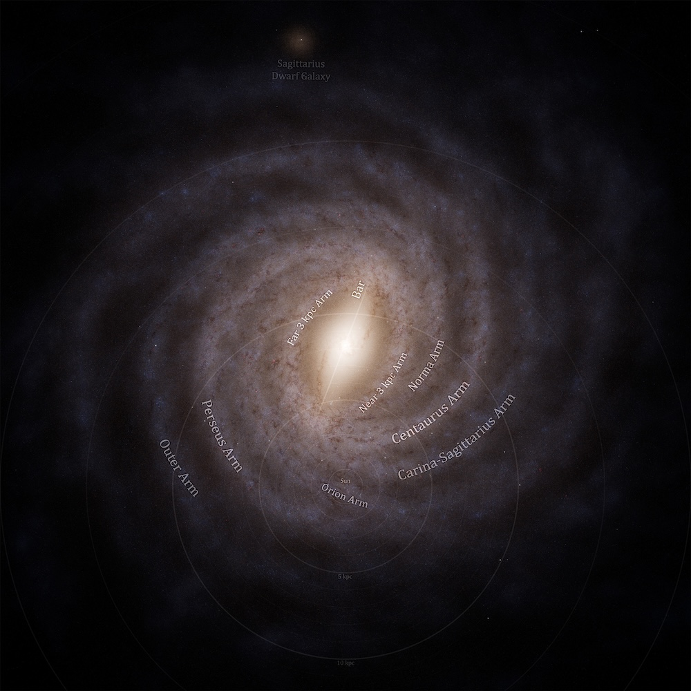 Вид Млечного Пути с обозначением спиральных рукавов. Высокое разрешение (10000x10000px, 19,5 MБ). Источник: ESA/Gaia/DPAC, Stefan Payne-Wardenaar - CC BY-SA 3.0 IGO