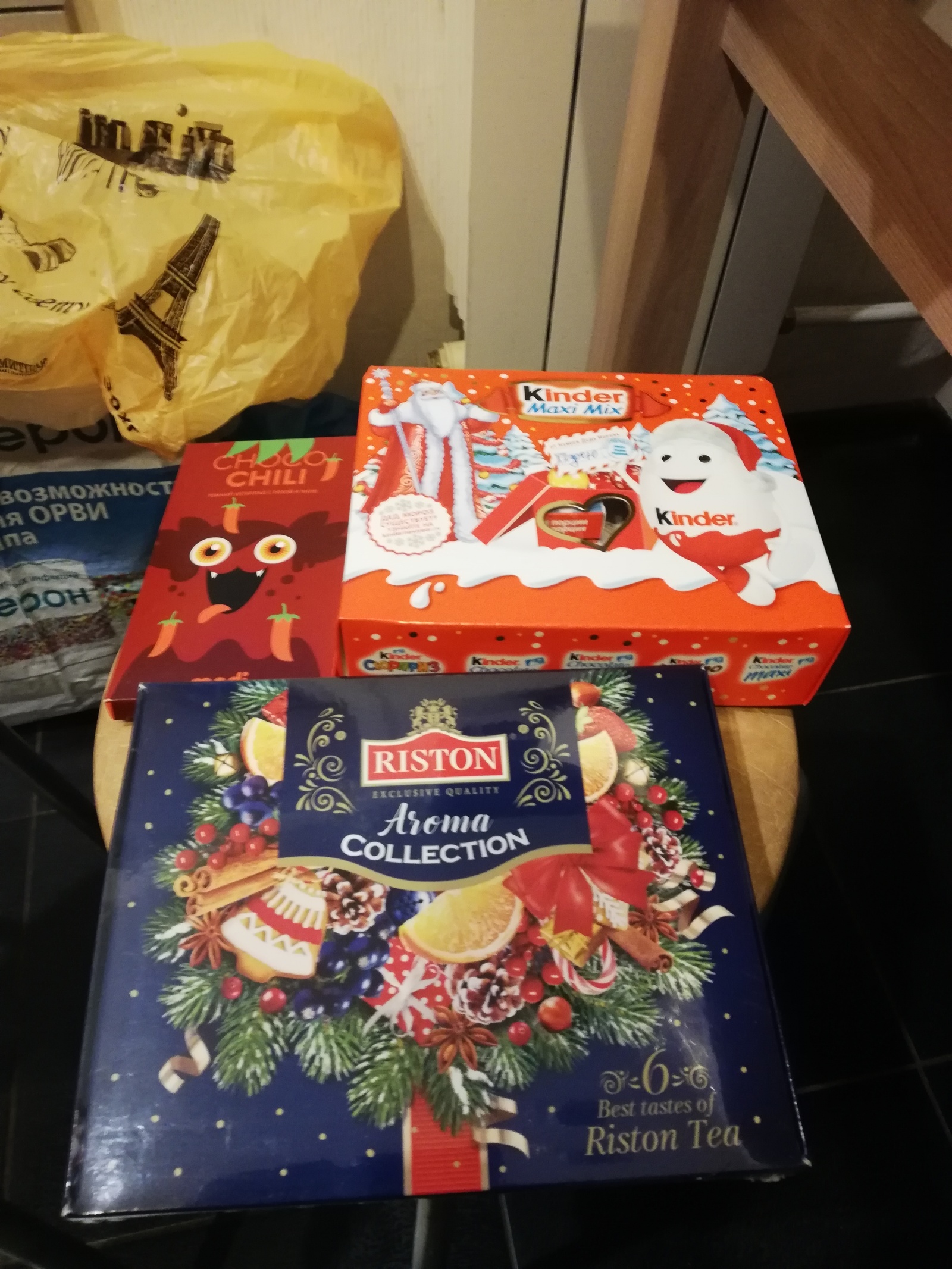 А именно: в категории "еда" было: упаковка чая, шоколадка и коробка конфет
