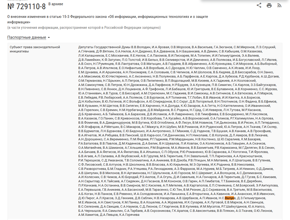UPD: Для прикола решил проверить свою "теорию", поискать недавно отметившегося в очередном популистском "обращении к народу" законотворца Валуева