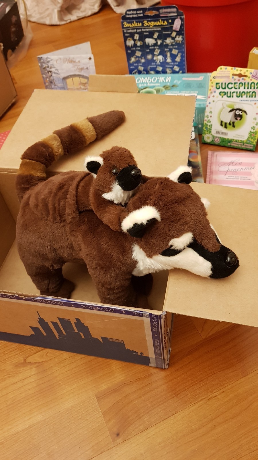P.S. у меня нет кота для типичного фото с котейкой в коробке, пришлось импровизировать с плюшевой носухой) Прошу прощения за опечатки, немного в эйфории от посылки)