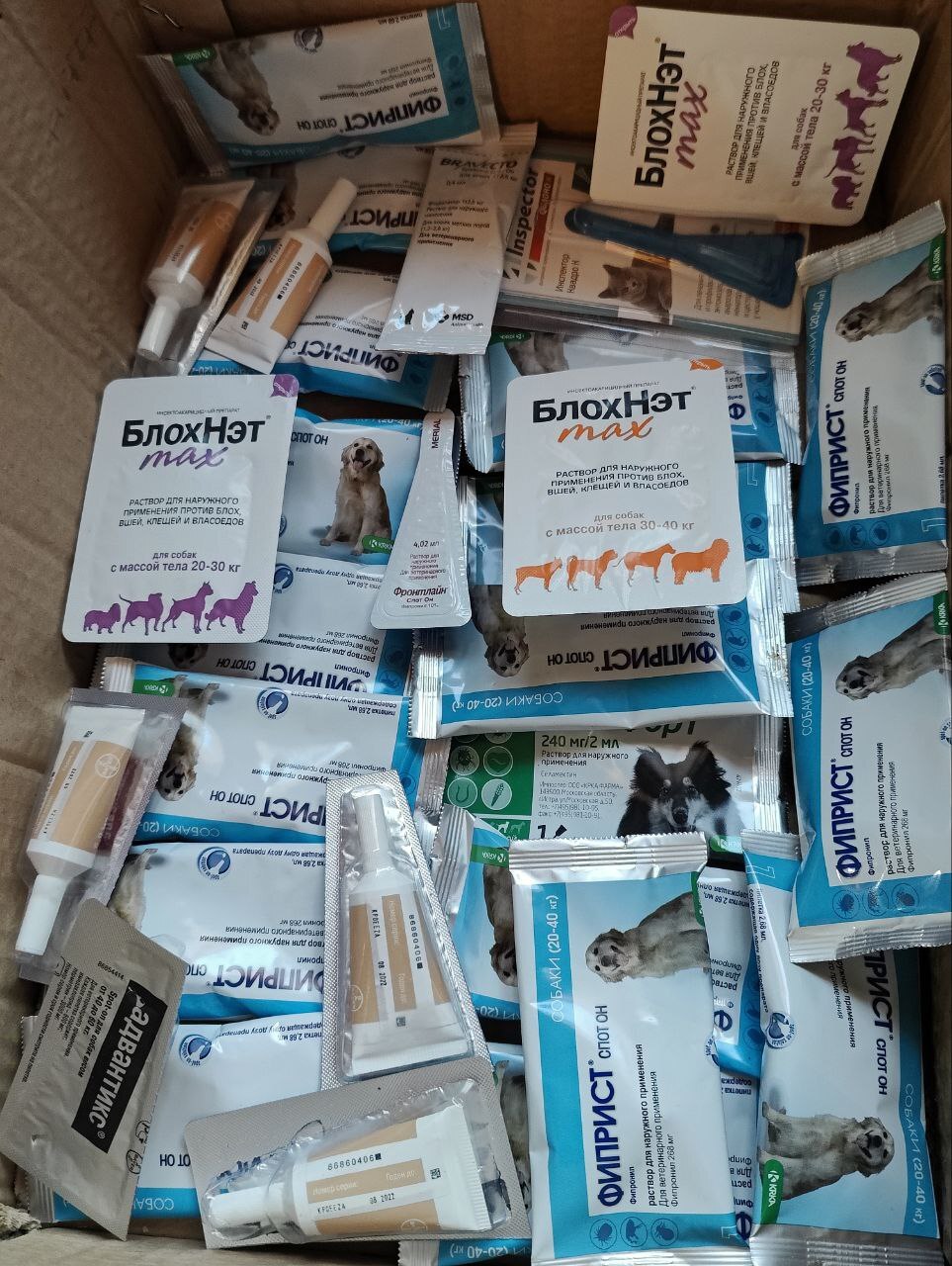 Еще мы чатом собрали посылку с обработками, которые очень нужны, так как животные очень страдают от блох (огромное спасибо Насте, ее отцу и Оксане, что смогли помочь с передачей посылки и Питера в Мариуполь). И огромное спасибо всем, что собирал посылку.