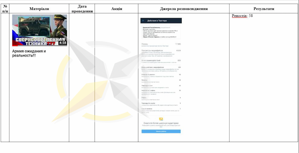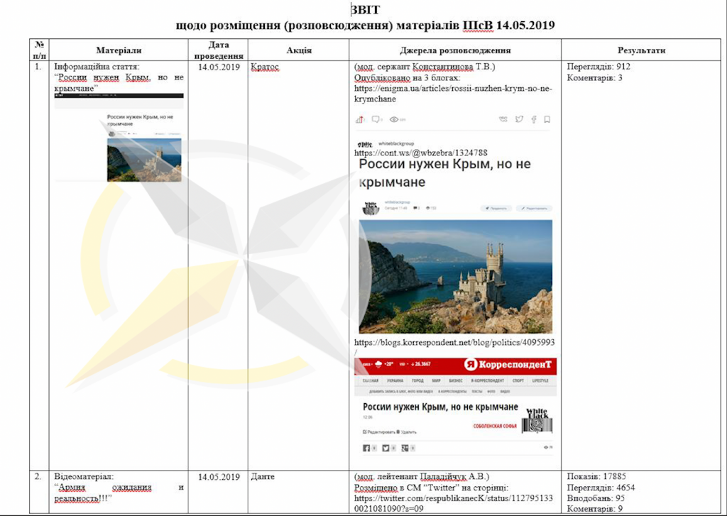 Представлены материалы, которые продвигались 83-м центром ИПСО Сил Специальных Операций ВСУ, даты их размещение, охват материала, ответственные сотрудники и названия «операций» в рамках которых распространялись эта низкопробная пропаганда, которая даже по закрытым отчетам 83-го центра ИПСО вызывает негативную реакцию у аудитории.