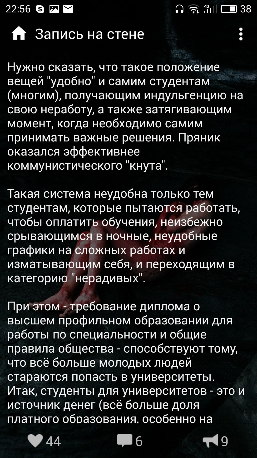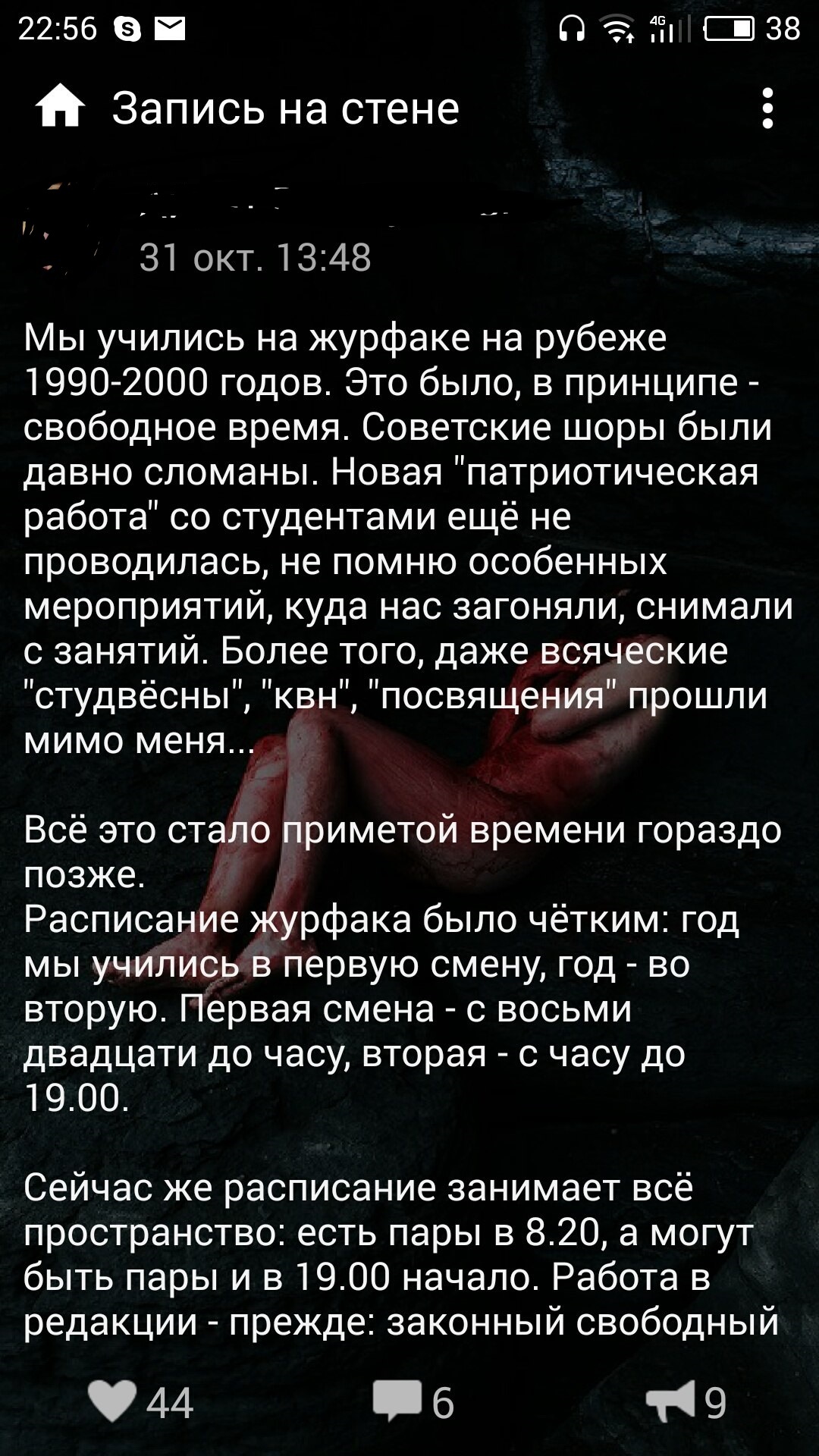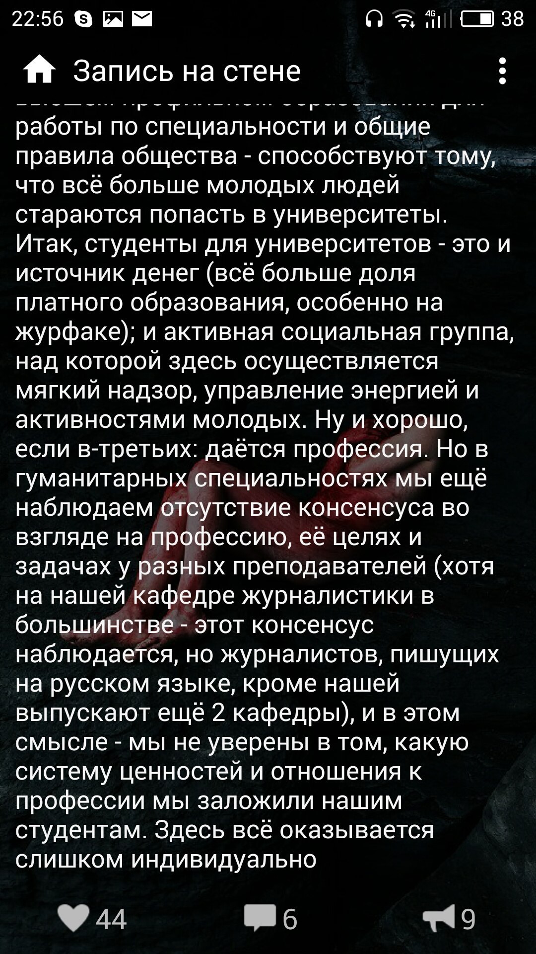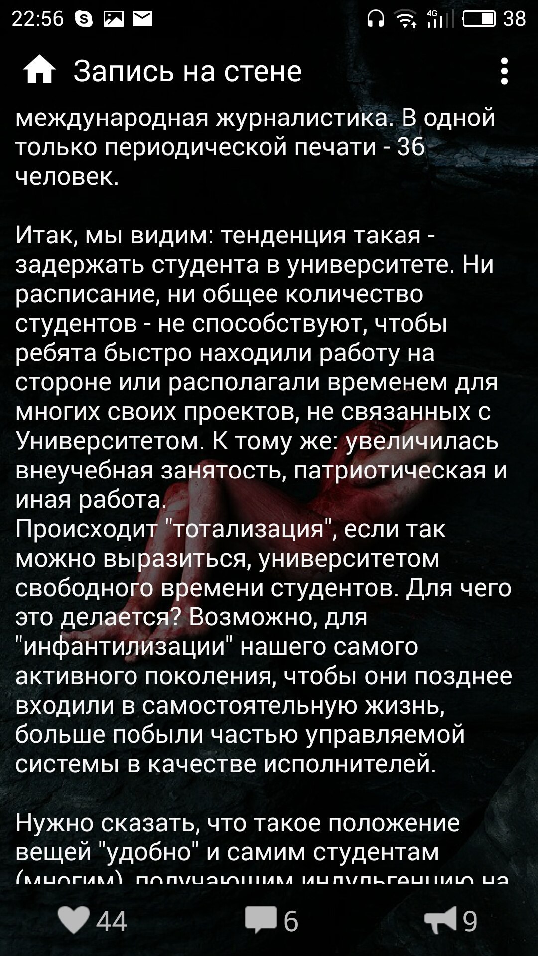 Приветсвую. Есть один университет. И в нем меня отчислили за один долг, без комиссий, без пересдач, из-за того, что я в коментах под одной записью перечил зав. кафедре. В итоге за один долг за один день был подписан приказ об отчислении. Типа, мне уже пришло предложение это всё осветить в одной газете. Сама ситуация крайне потешная. Я, конечно, понимаю, де, сам виноват, не надо было хвостов набирать, но сам факт того, что один человек из-за комента может тебя отчислить за день - крайне потешен. Ну и да, сам пост на стене одного из преподавателей, которого лично я уважаю.