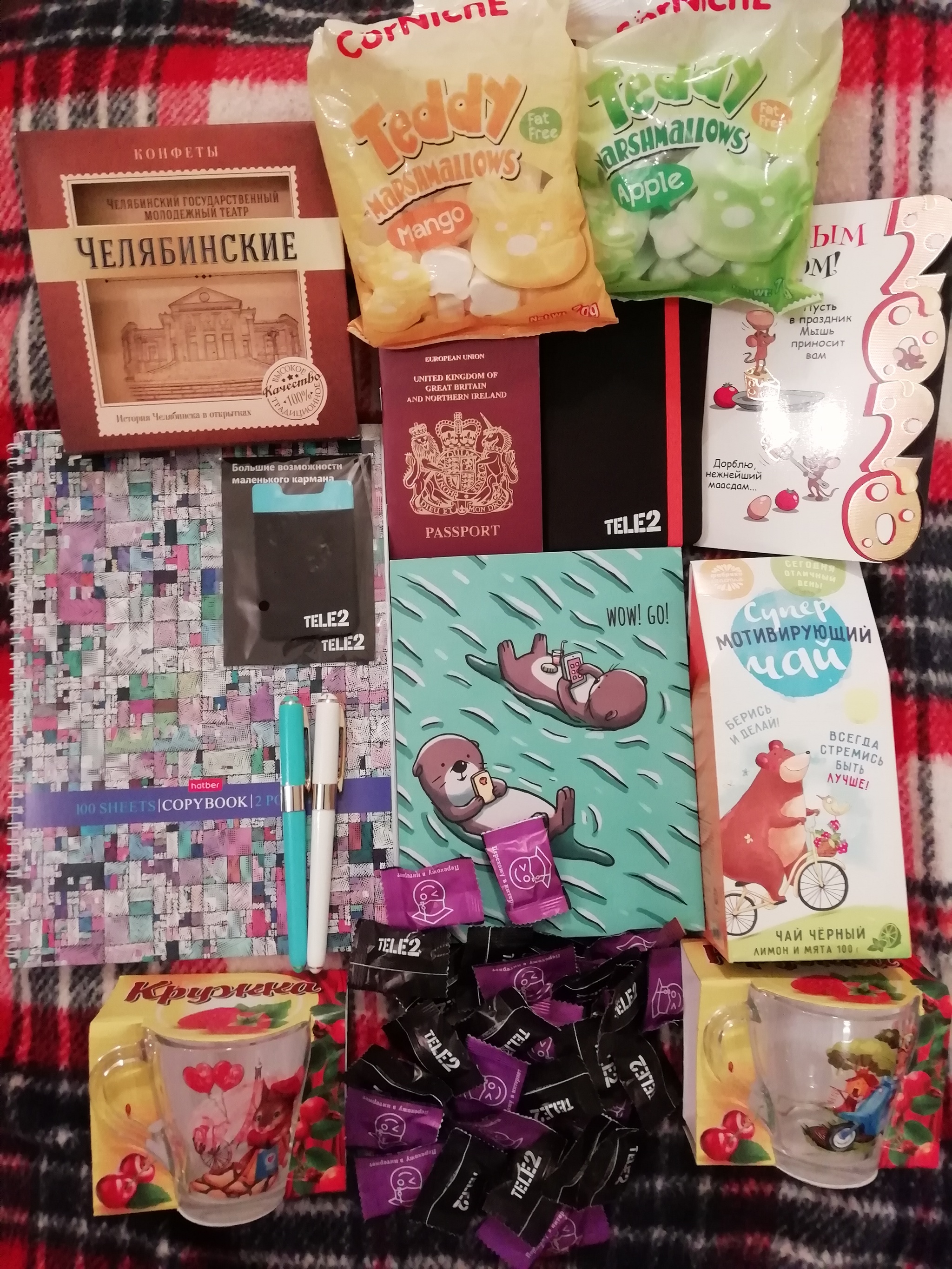 Четвёртый год моё новогоднее настроение начинается с пикабушного обмена подарками. В этом году Тайный Санта подогревал моё ожидание через смс, благодаря чему было ощущение детской радости и предвкушения. Понять всю мою радость от подарка смогут, наверное, такие же канцелярские маньяки, как я) Олени Санты привезли мне две замечательные ручки моей любимой фирмы, тетрадь А4 (с карманом и листами с перфорацией) , тетрадь с каланами на мягкой обложке (давно хотела такого типа, а тут ещё и каланы), две записные книжки - одна "паспорт UK", вторая с кармашком и на резинке (очень классная обложка на ощупь). А ещё накладной карман для карт или бумажек, чай с мятой и лимоном, парные кружки с разнополыми символами наступающего года нам с мужем, вкусные челябинские конфеты и маршмеллоу с разными вкусами (на фото уже вскрытые, мы не удержались), открытка с теплыми словами для нашей семьи и много-много леденцов. Каждая составляющая подарка была невероятно тщательно упакована в плёнку и всё доехало в целости и сохранности.