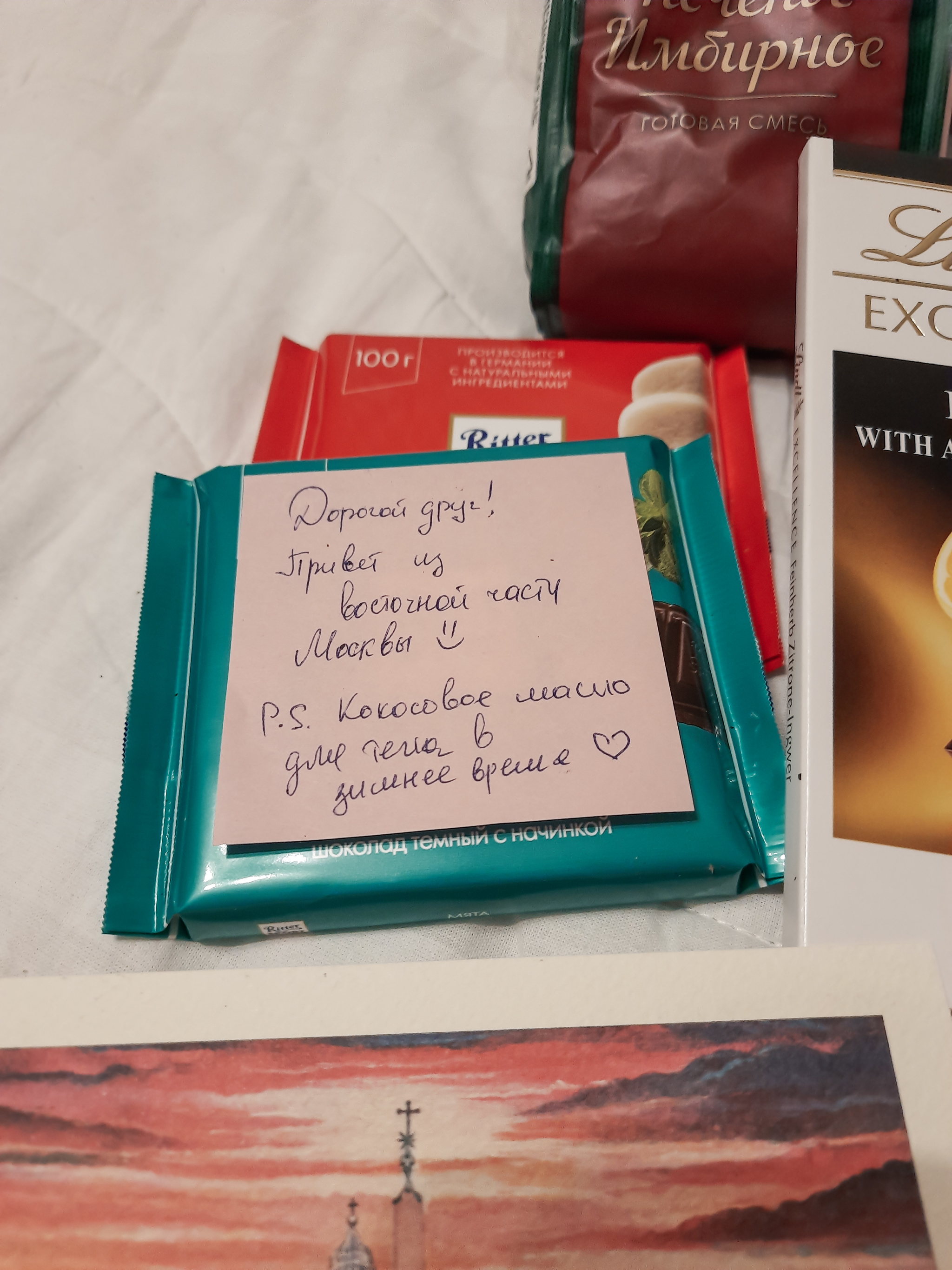 Здесь у нас шоколадки, кокосовое масло для тела, смесь для выпечки печенья, листовой чай, открытки из разных стран и блокнот. Состав посылки прямо таки уговаривает включить фильм, посидеть поесть в тепле и уюте, чем я собственно с радостью занялась!