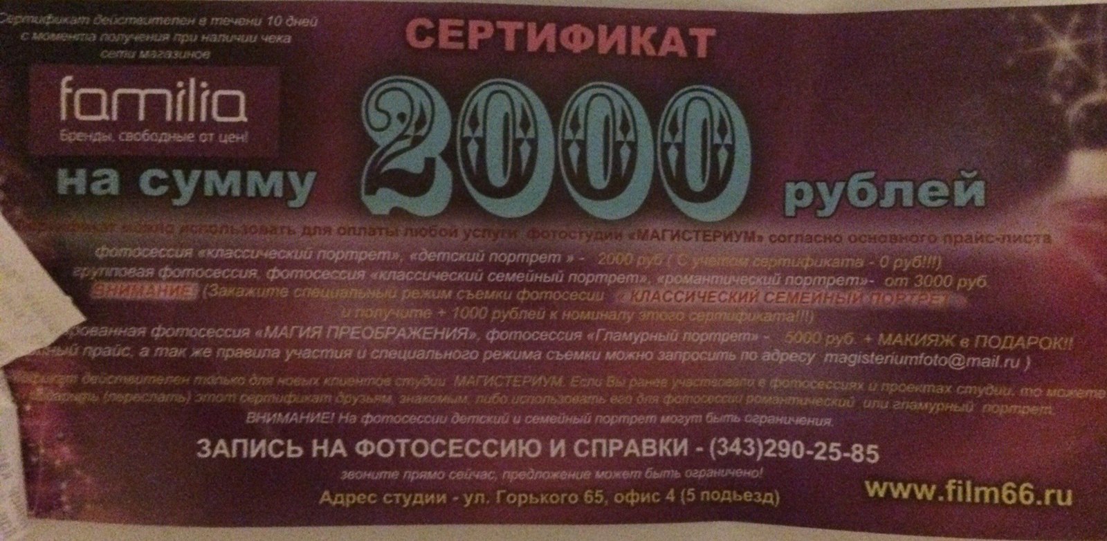 Отдам безвозмездно, то есть даром, сертификат на 2000 рублей на фотосессию в студии Магистериум, г. Екатеринбург.