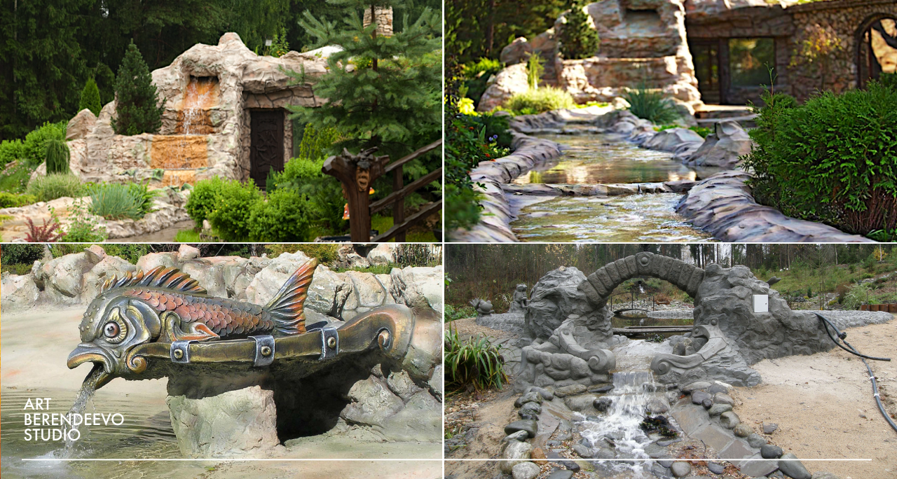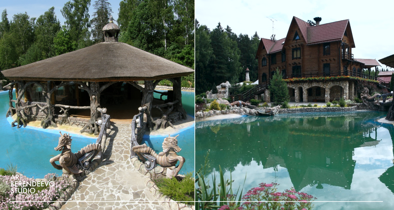 Услуга изготовления пруда от ART BERENDEEVO STUDIO также включает в себя разработку и создание уникального декора береговой линии и прилегающей территории. Являясь частью общего дизайн-проекта, элементы оформления декоративного пруда выполняются в едином стиле, органично дополняя архитектурно-ландшафтную среду. Среди таких декораций могут быть не только искусственные камни и валуны, но также скульптуры и скульптурные композиции, пирсы и беседки.