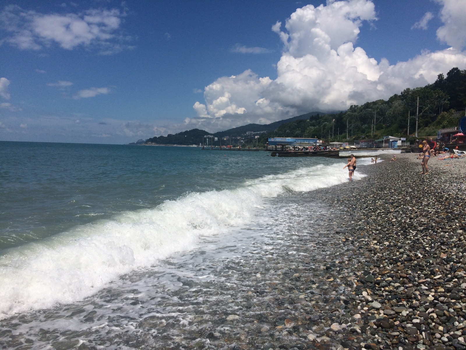 Отдельно хочется сказать о пляже. От моего дома - далековато (примерно, километр), но это даже неплохо, есть возможность пройтись. Ближе всего мне был муниципальный пляж "Робинзон". Чистота, порядок, внимательный спасатель Сергей (он ни на минуту не отвлекался во время шторма, постоянно напоминая отдыхающим об опасности вблизи воды, особенно смотрел за детьми). После шторма пляж моментально приводился в порядок. Но я бы и не заметила, не обратила внимания - ну чисто и чисто (так и должно быть!), если бы в эти же дни мы не попали на пляж в Гагре - отдыхающие загорают прямо среди мусора, вынесенного водой на берег... Но Абхазия... - это отдельная история...