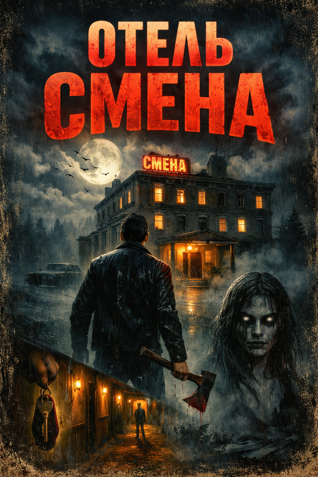Здание появилось внезапно: двухэтажное, вытянутое, с тёплым светом в окнах и старой неоновой вывеской «СМЕНА», где несколько букв уже не горели. На парковке не было ни одной машины. Уже тогда стоило развернуться, но усталость победила. Внутри оказалось тепло, слишком тепло. Линолеум, панели на стенах, часы с громким тиканьем. За стойкой сидела женщина с пустым взглядом, как будто смотрела сквозь нас.