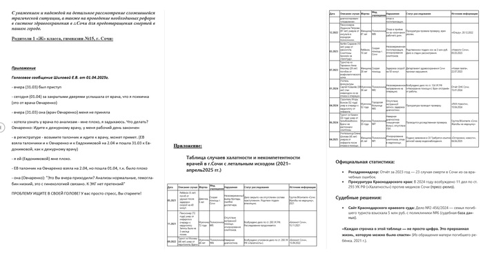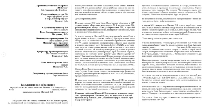 В начале апреля 2025 года Елена Валентиновна обратилась в ГБУ здравоохранения «Городская поликлиника» № 1, подразделение №4, расположенную по адресу: г.Сочи, ул.Абрикосовая, 21А, с просьбой оказания первой неотложной помощи, в которой ей было отказано, через 3 дня она скончалась от инфаркта.