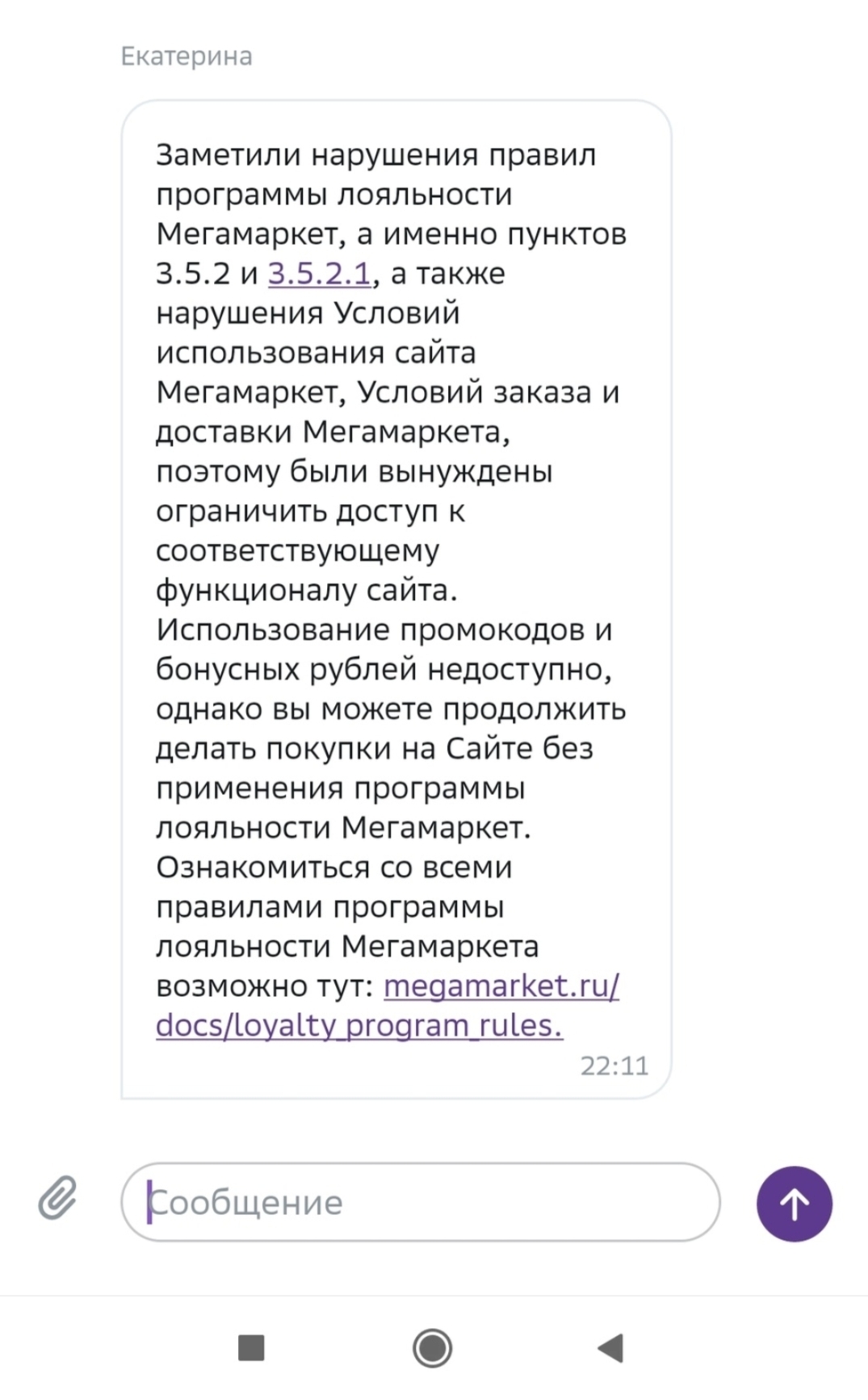 Мое обращение: Здравствуйте. Могли бы вы, пожалуйста, объяснить мне, почему меня отключили от программы мегамаркета? Я не злоупотреблял кодами, не создавал дополнительных аккаунтов, не злоупотреблял баллами, и не нарушал правила получения и использования баллов.