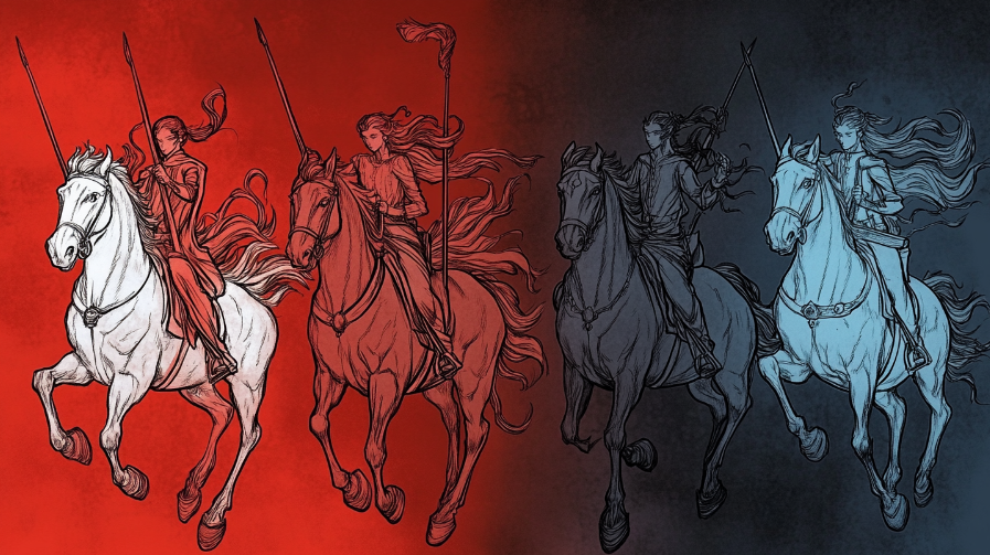После снятия Агнцем первых четырёх печатей, Иоанн увидел четырёх всадников на белом, рыжем, вороном и бледном конях, которые символизировали войну, междоусобие, голод и смерть. После снятия пятой печати он увидел души мучеников под жертвенником, которые взывали к Богу о суде над гонителями, но им было сказано подождать, пока не исполнится число святых. При снятии шестой печати начались великие космические катаклизмы, испугавшие всех живущих на земле.