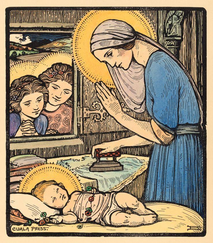 Но особую популярность в Ирландии они получили во время массовой миграции, когда было очень популярно отправлять традиционные зелено-золотые открытки с кельтскими мотивами своей многочисленной родне по всему миру. Ну и конечно же, в строго католической стране были популярны религиозные сюжеты. Один из них был от издательства The Cuala Press. Где Дева Мария гладит одежду возле спящего Иисуса (я буду искать такую себе в коллекцию!).