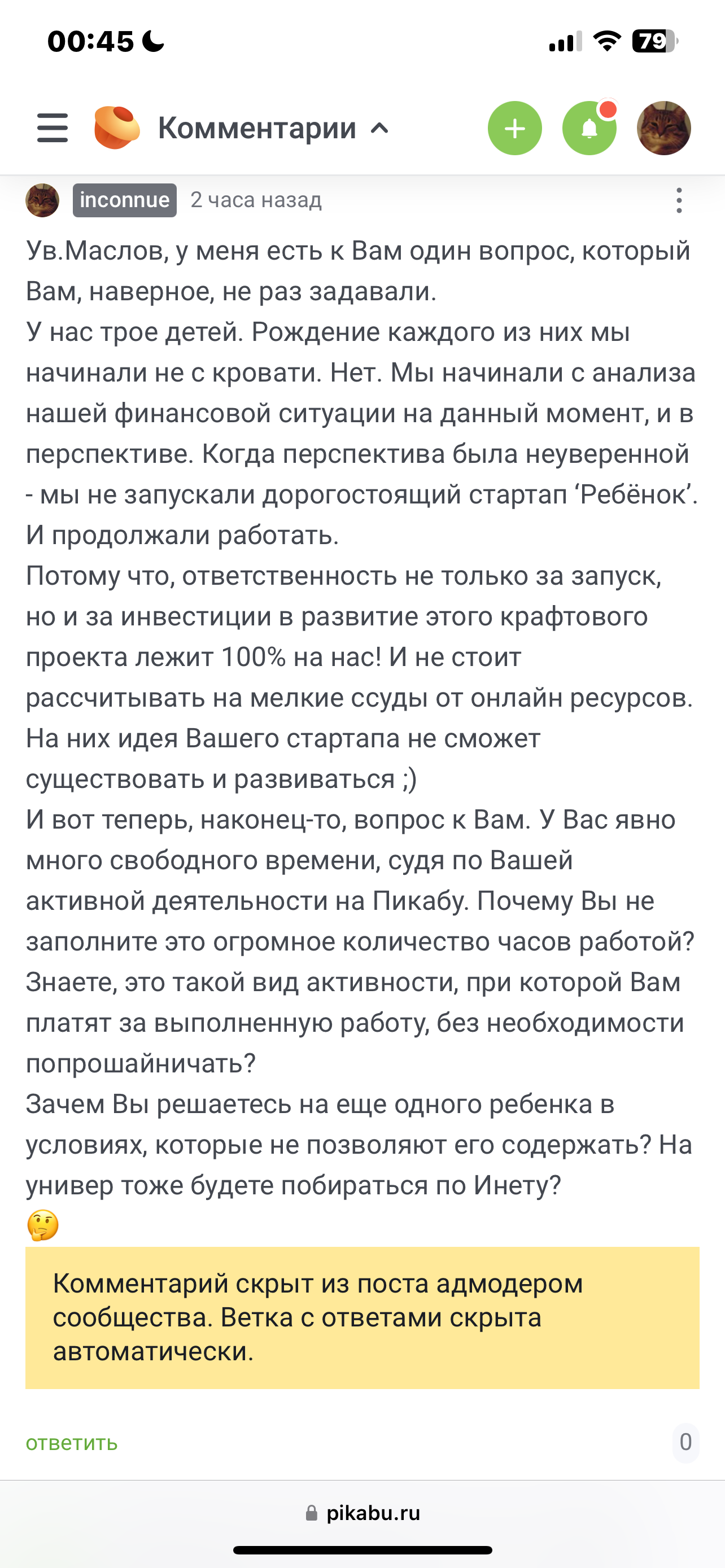 Вот собственно коммент/вопрос. Полагаю, что г-ну Маслову он показался вредоносным для его сбора денег на размножение ))