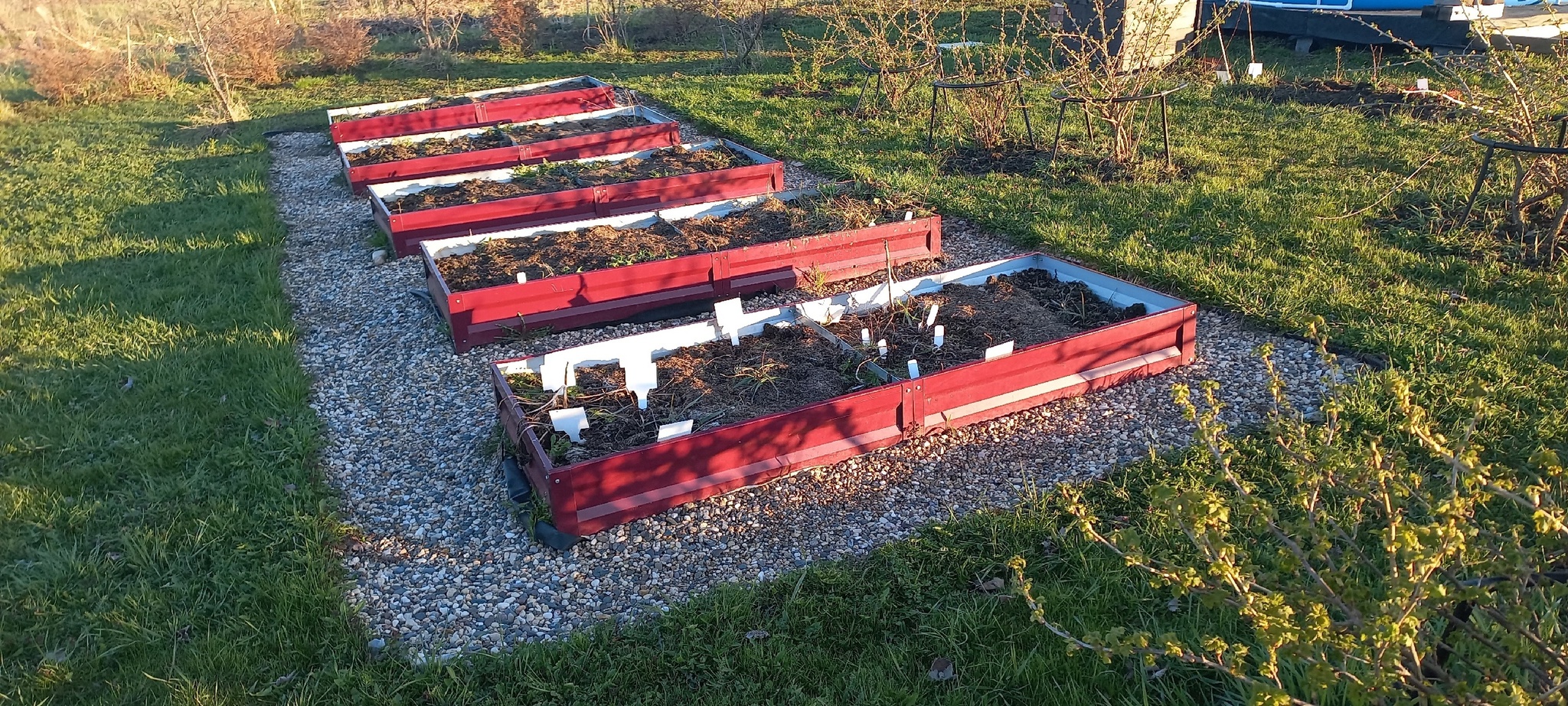 Огород малюсенький. Потому что "не огорода ради". Оцинкованные грядки зимуют тоже вторую зиму, а камни вокруг - первую. Отсыпку я делала сама в прошлом году. В этом буду продолжать, очень понравилось (не делать, конечно, делать - чуть тяжело...))