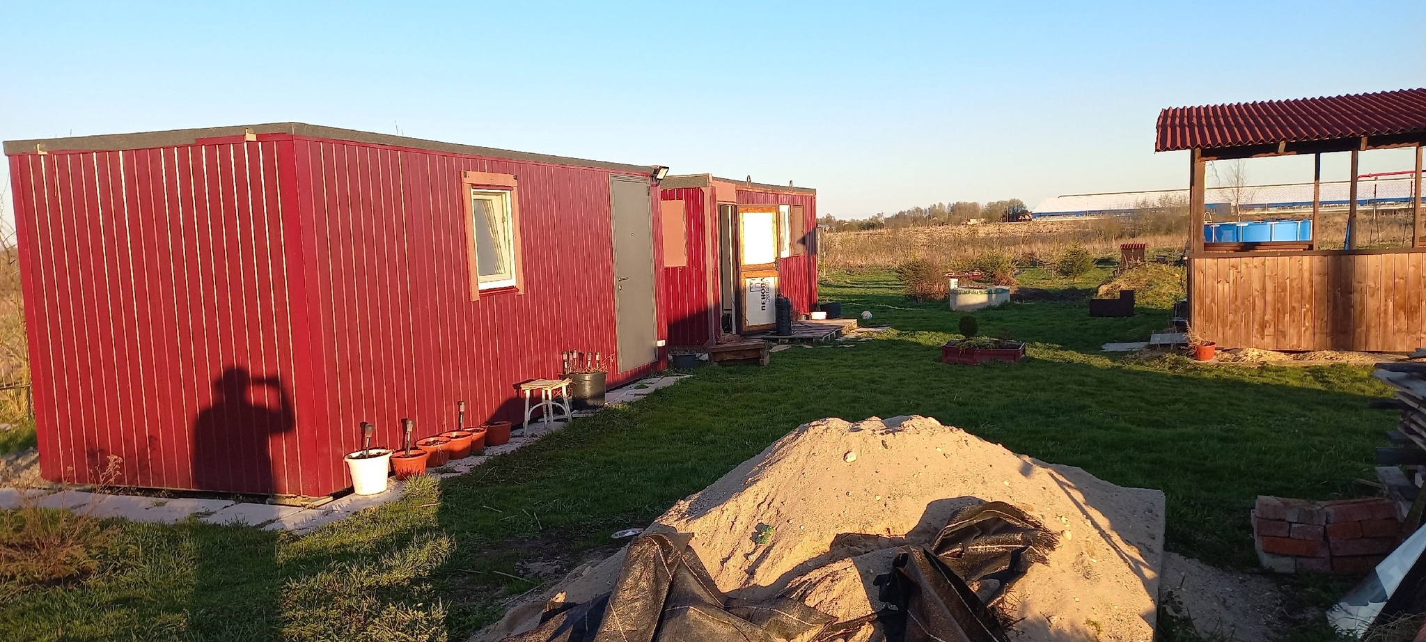 Вот так началась наша дача. В первое лето муж делал отделку внутри, во второе построили с ним маленький сарайчик, посадили два ряда картошки. В следующие года: картошка расширилась, деревья и кусты образовались, обожаемая беседка на месте, каркасный бассейн на подиуме. Жить стало веселее, но не очень удобнее. Дом хотелось всё так же, но основательный дом. Денег мы стали зарабатывать больше, но не настолько, чтобы начать строительство. Поэтому просто купили вторую бытовку. Также отделку муж полностью сделал внутри. Может быть, я потом напишу, что там и как.