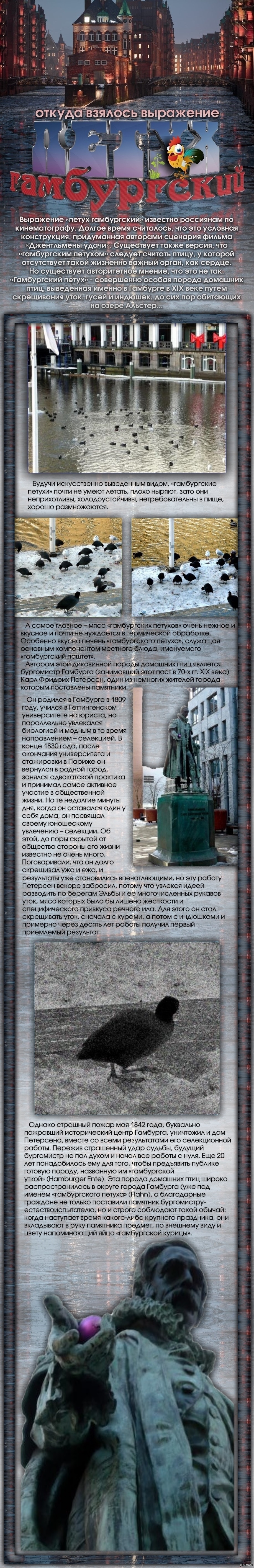 отсюда: http://alteriter.ru/node/209 P.S. ...по другой версии: это крылатое выражение происходит из дискуссии еврейского вундеркинда - раввина, законоучителя и каббалиста Йонатан Эйбешиц (в 14 лет ставшего раввином) Спор касался кашерности петуха, в теле которого не нашли при разделке сердца. И хотя, согласно закону Торы, отсутствие такого жизненно важного органа делает животное непригодным в пищу (трефным), Хахам Цви признал мясо этого петуха кашерным. Согласно его мнению, поскольку жизнедеятельность петуха без сердца немыслима, оно наверняка было, но потерялось при халатной разделке. Однако другой авторитетный гамбургский раввин признал петуха трефным – поскольку сердца все же не имелось в наличности. И тогда два раввина обратились за решением своего спора к ведущим законоучителям Европы – на этот зов и откликнулся двадцатилетний р. Йонатан Эйбешиц. Он обратился за разъяснениями к физиологам. Оказалось, что уже были зафиксированы случаи, когда птица рождалась совсем без сердца, но в процессе жизнедеятельности образовывался компенсаторный орган, выполняющий функции сердца. Такая птица может существовать, но, согласно алахе, она не пригодна в пищу – и р. Эйбешиц признал гамбургского петуха трефным.