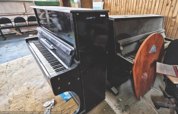 Свой осмотр мы начали с большого физкультурного зала, который оказался на первом этаже. Сюда же перенесли почти все имущество школы, начиная от парт и заканчивая несколькими фортепиано.