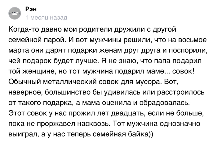 Муж моей сестры подарил нашей маме метлу (она в деревне живет) со словами "летайте на здоровье." Мама была в восторге, давно такую хотела.