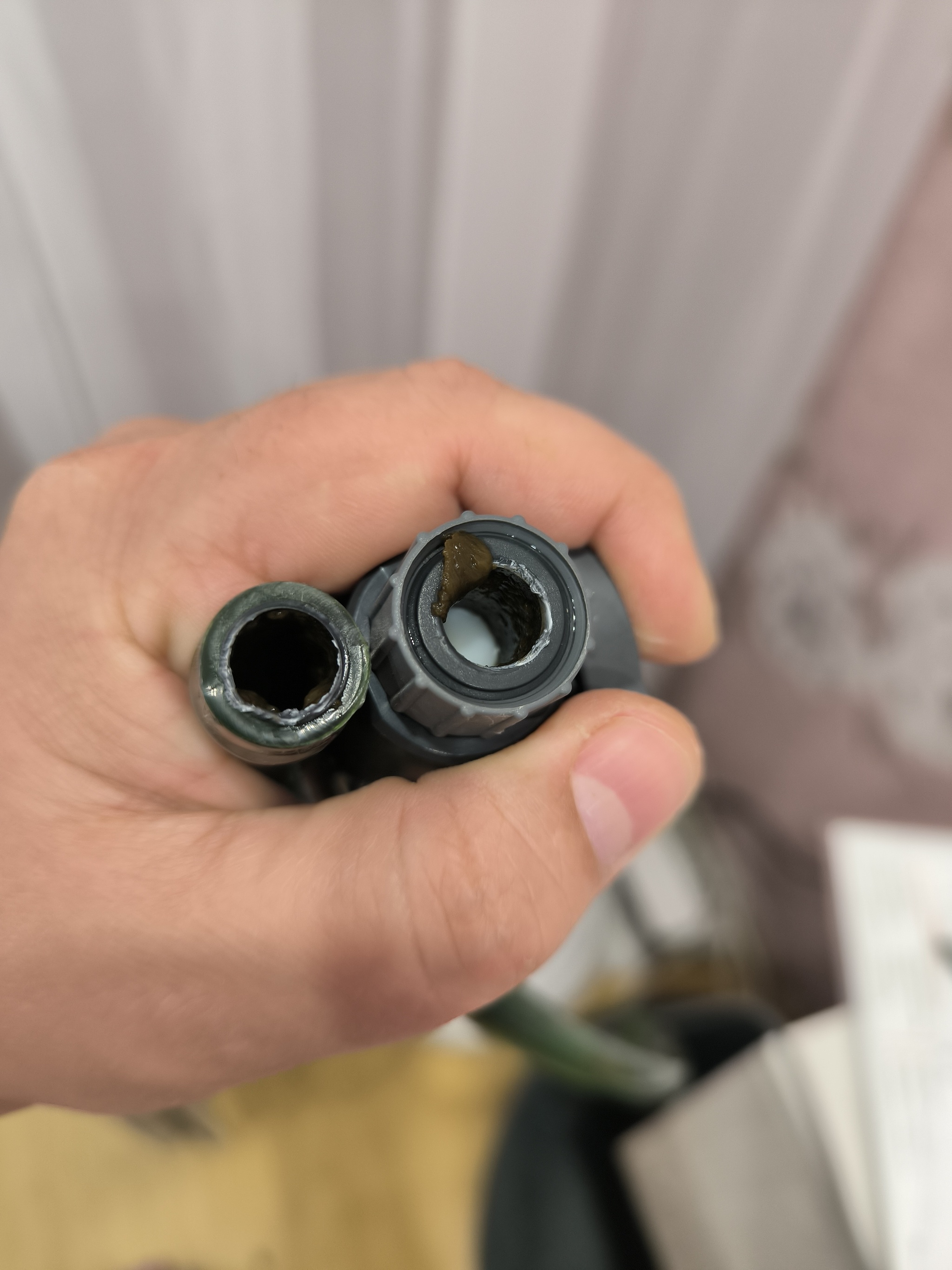 Сегодня утром улетать на самолёте на отдых, что-то дёрнуло меня в тумбу заглянуть, а с одного из кранов капает. Понимаю, что капает не из соединений, а там, где трубка одета. Но она так плотно одета, не может там капать... Начинаю тянуть на себя, что посмотреть, и штуцер, на который трубка натягивается, просто отваливается.