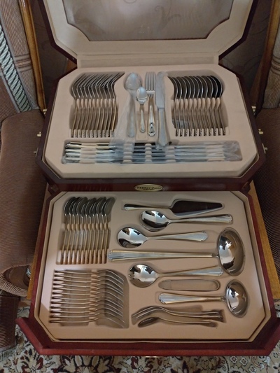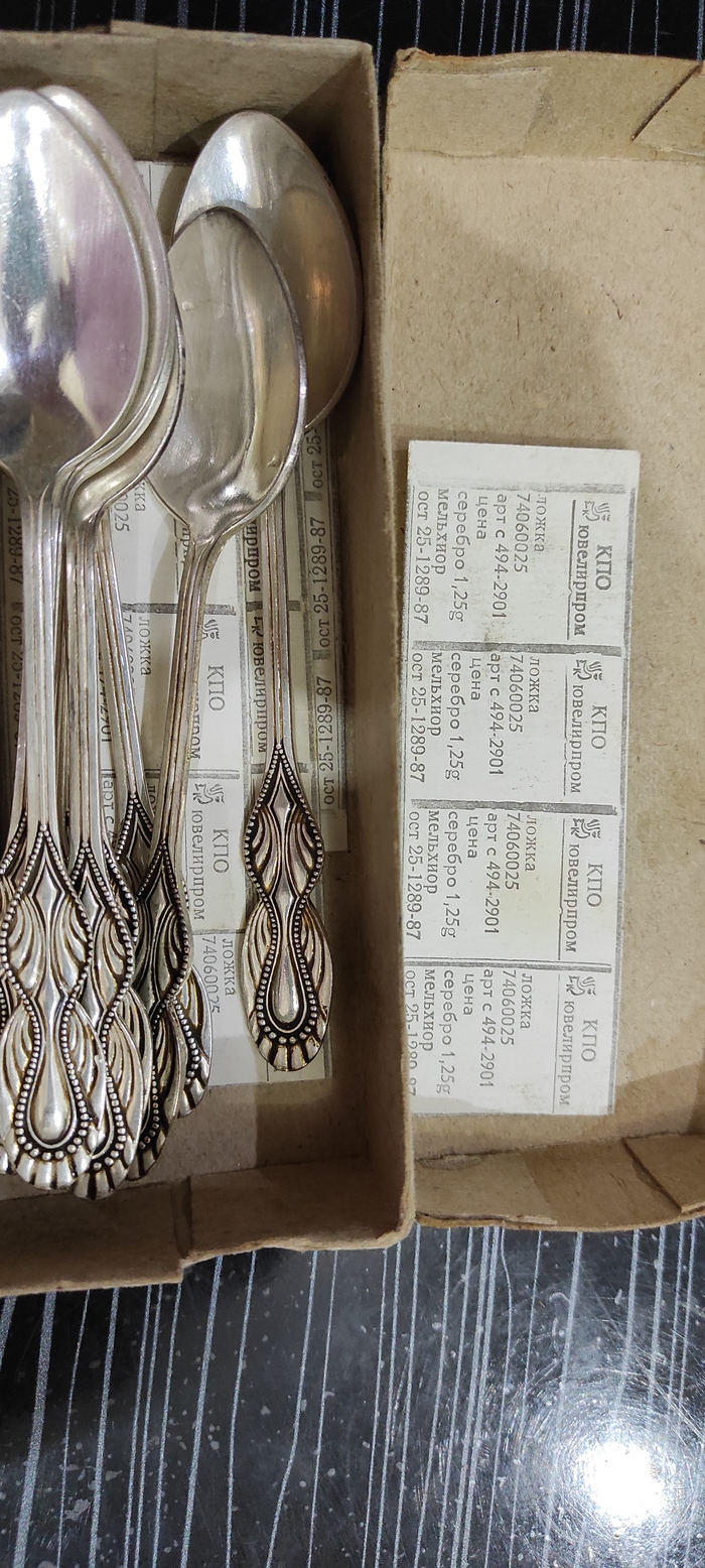 Два набора столовых приборов посеребренных, и 12 маленьких ложек, тоже посеребренных.
