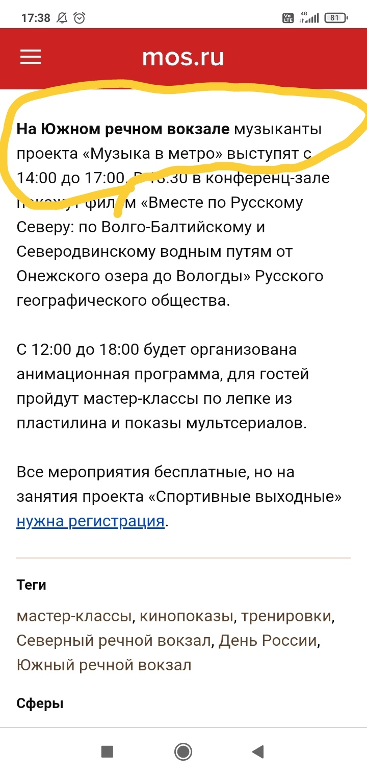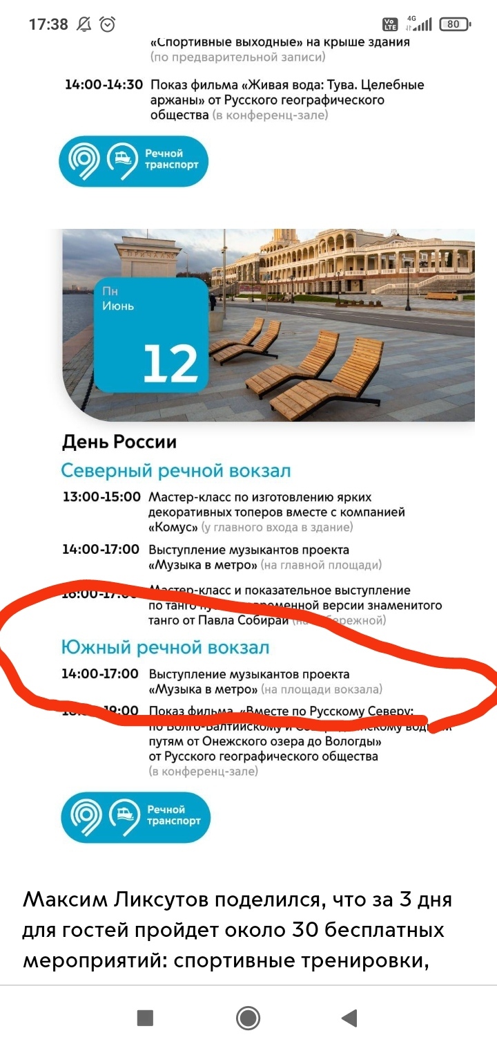Мэр Москвы и его заместитель на официальном портале анонсировали концерт в рамках проекта "Музыка Метро", который должен был пройти сегодня с 14:00 до 17:00 на территории Южного речного вокзала в Москве.