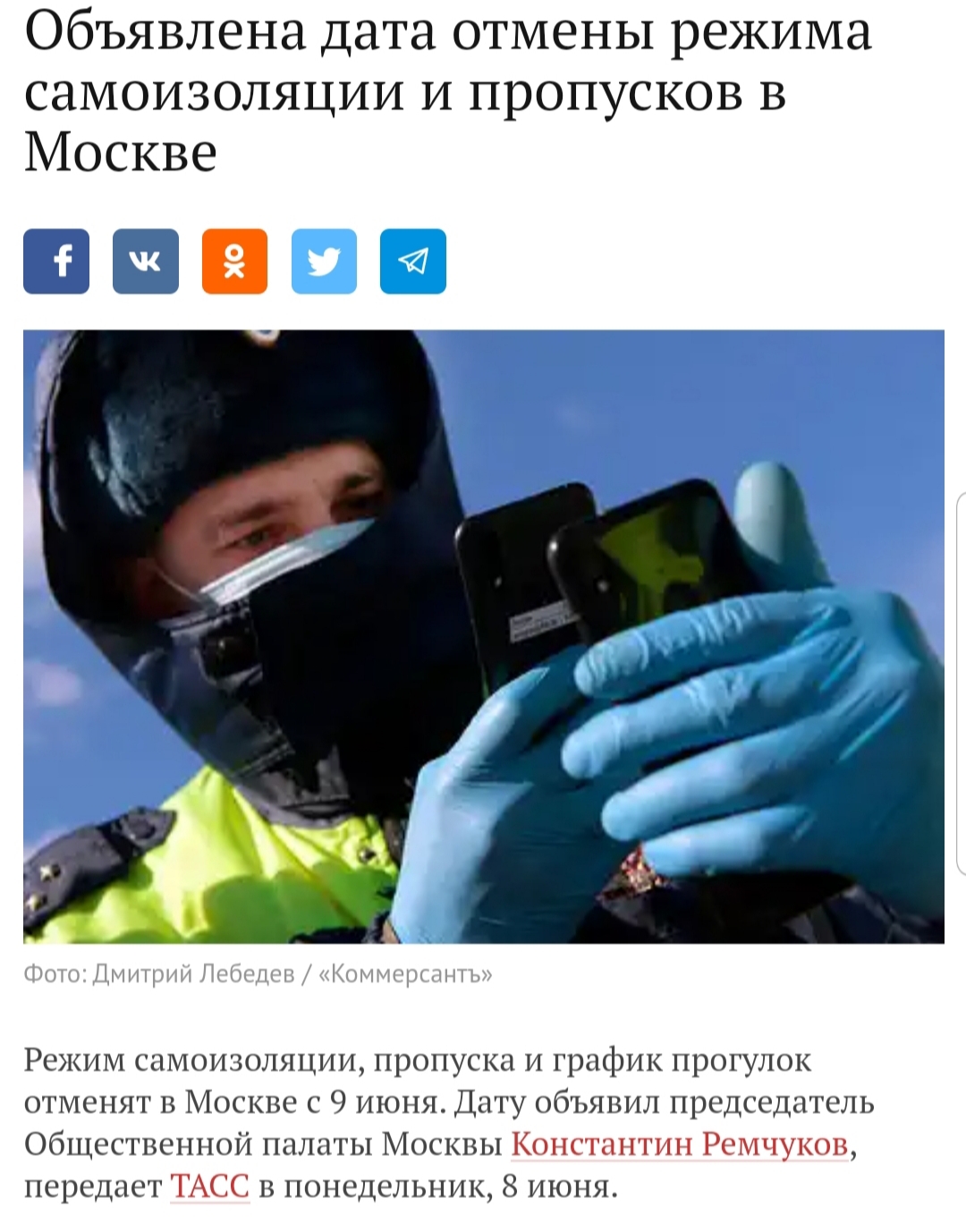 Глава Общественной палаты Москвы Константин Ремчуков заявил, что уже 9 июня в столице будут отмены режим самоизоляции и электронные пропуска.