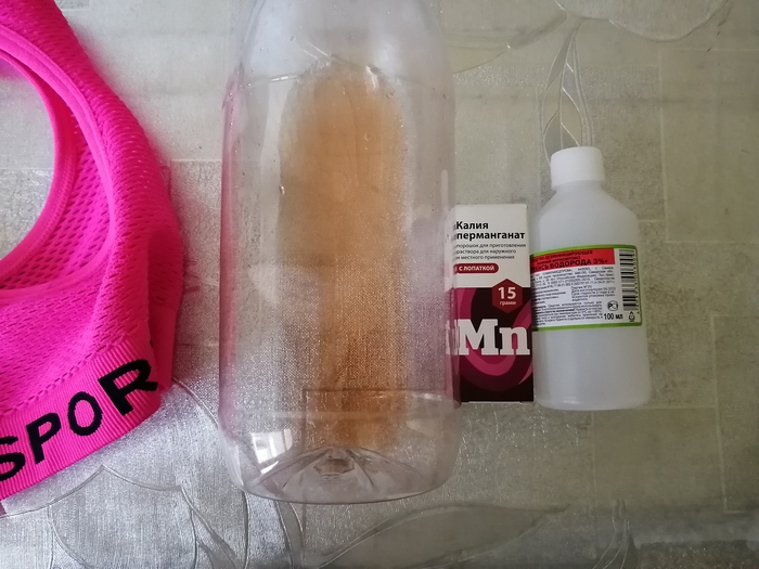 Так вот, с помощью яблочного уксуса (был под рукой он), марганцовки и перекиси водорода (3%) мы полностью удалим чернила: