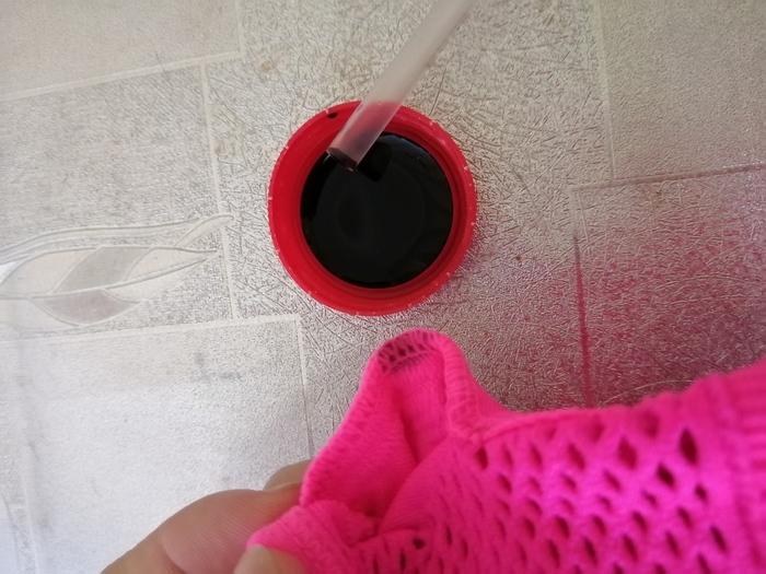 Далее наносим раствор на реальное пятно от ручки. Не бойтесь уделать одежду марганцовкой 😂