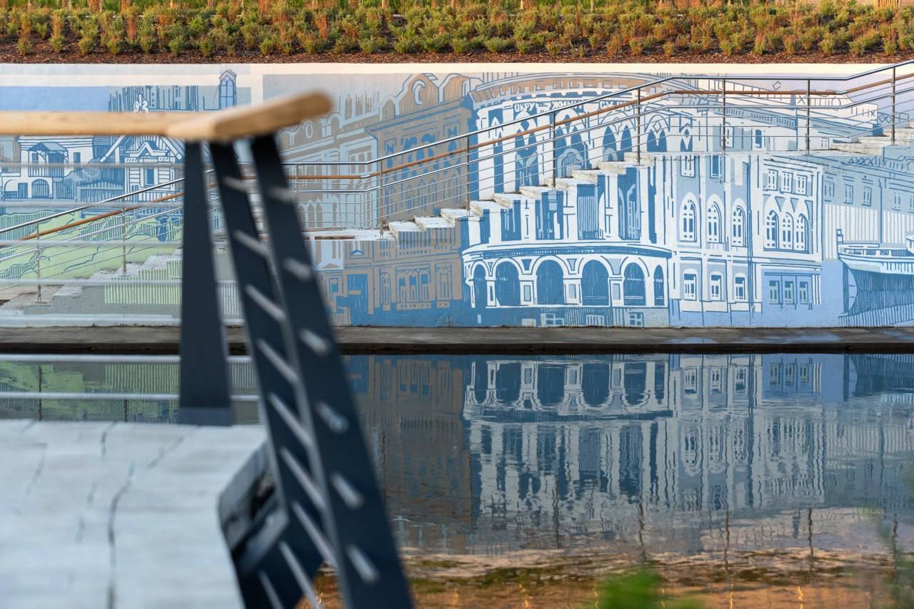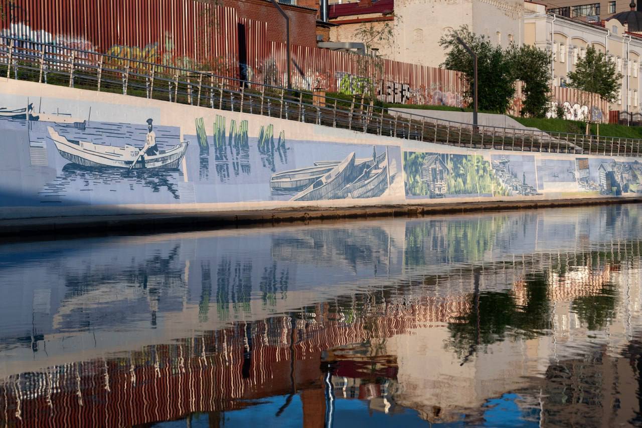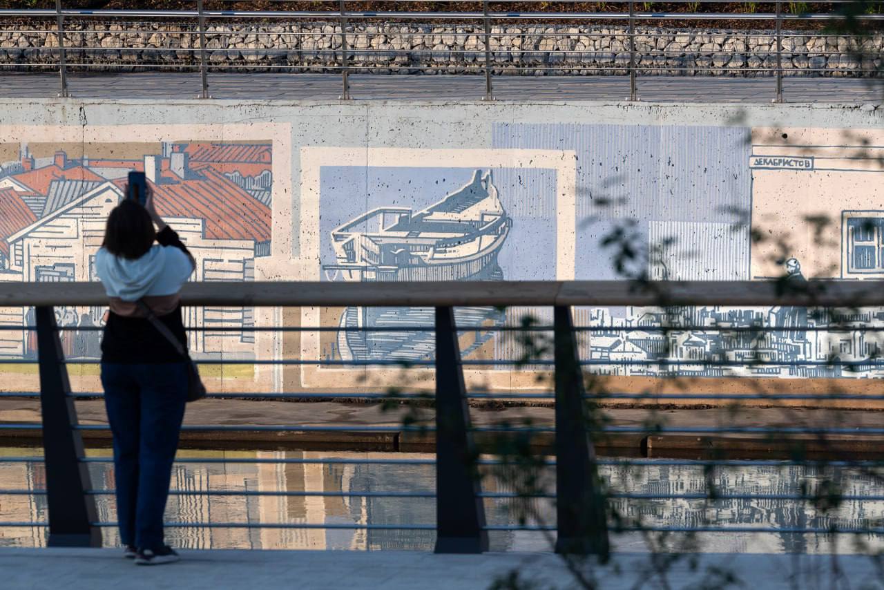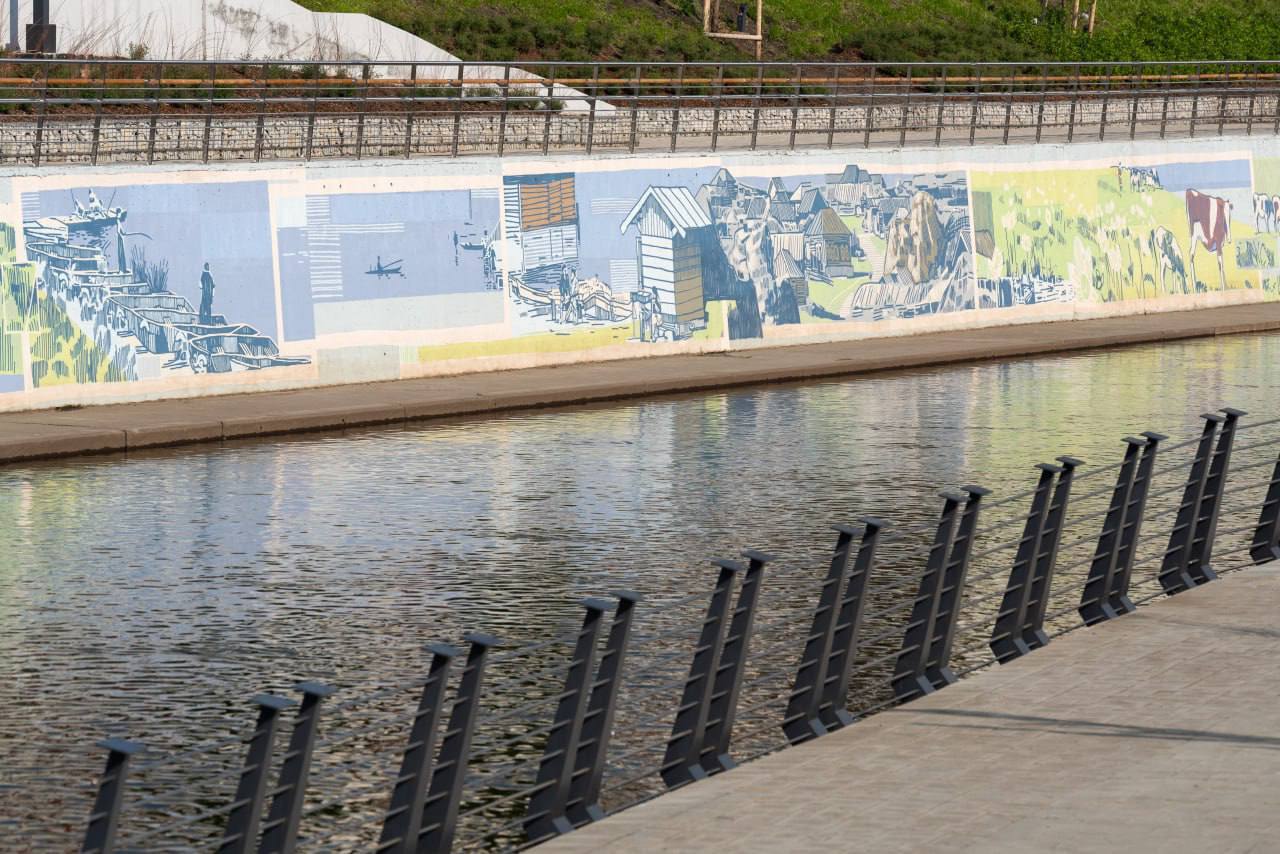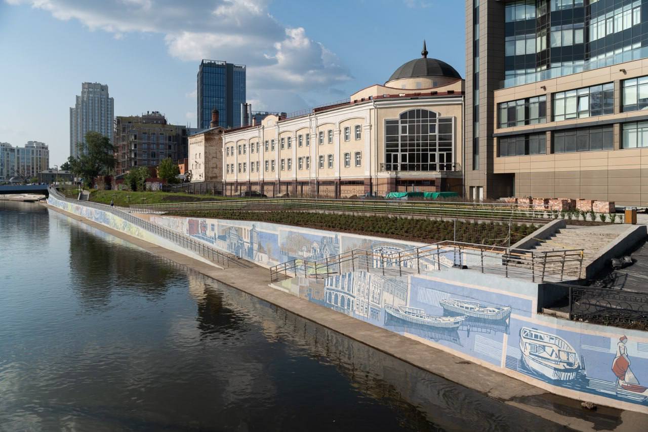 На набережной Исети в Екатеринбурге художник Мансур Зияев создал масштабный арт-объект. Уже сейчас любой желающий может полюбоваться итоговой работой. Художник вдохновился архивными кадрами Екатеринбурга.