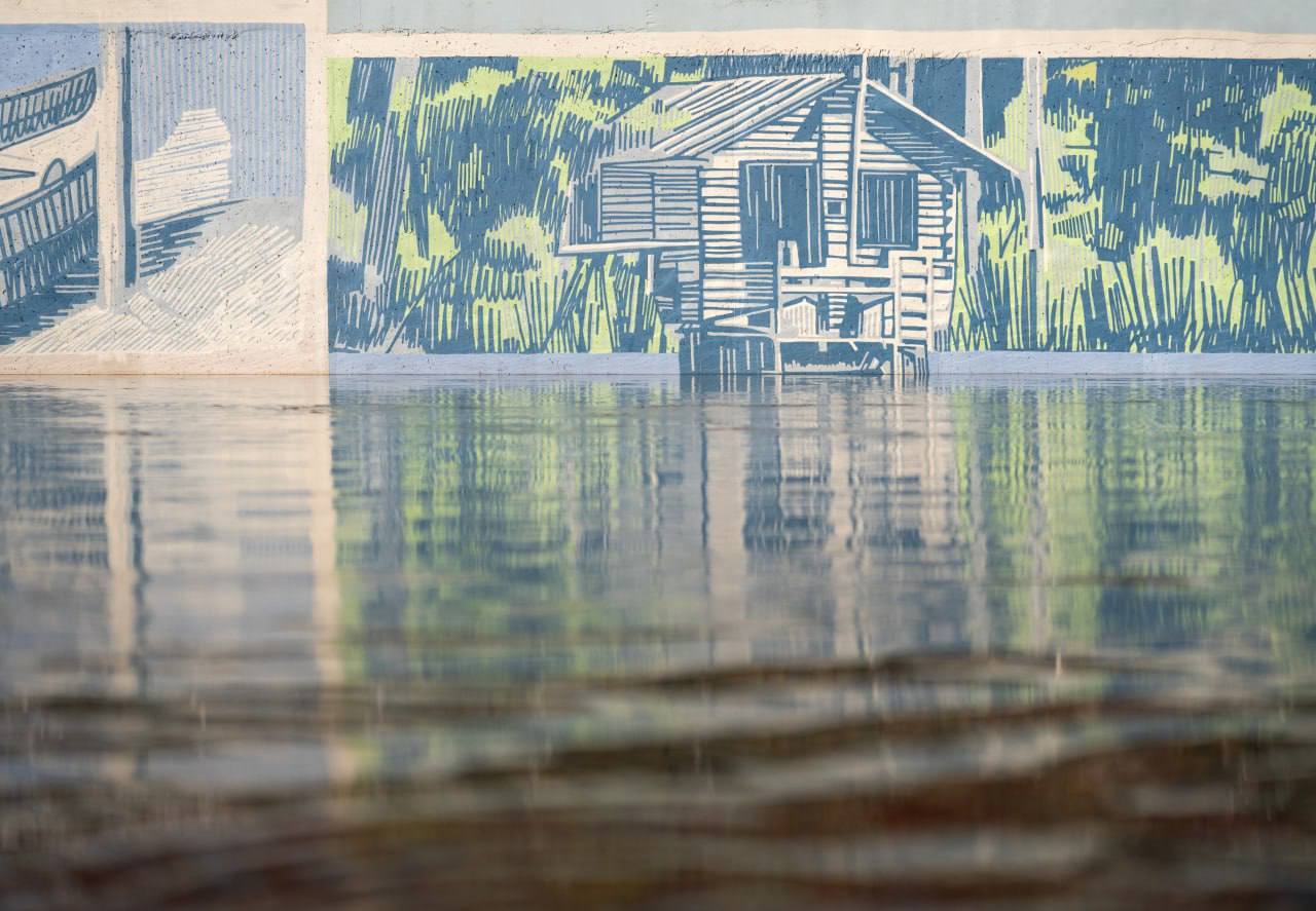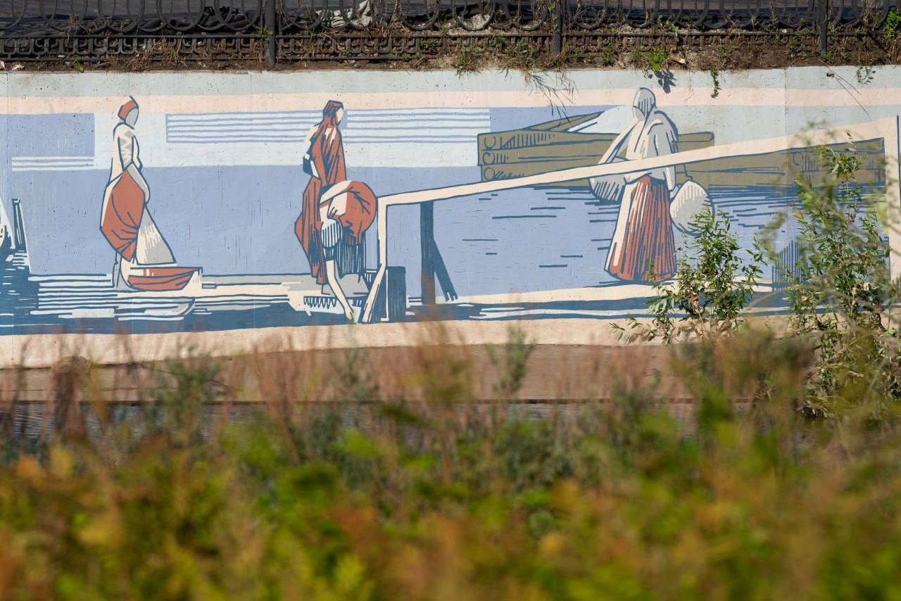 «Принцип формирования сюжета исходил из запроса «город и природа». Также я опирался на среду: на месте есть Царский мост, и я понял, что городской сюжет будет ближе к этой сложной архитектурной форме. В начале мурала сюжеты о природе, речке, воде. А в центре — плавный переход через деревню, коров, панораму города, деревянные частные дома, переходящие в среду старого Свердловска. Если смотреть слева направо, то будет читаться мотив перехода от природы к городу», — объясняет художник Мансур Зияев.