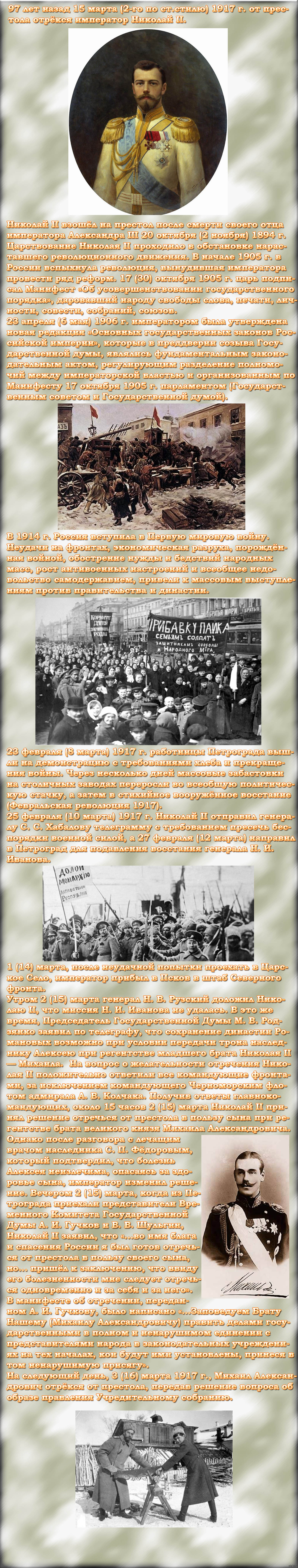 Тут не сказано, почему миссия Иванова не удалась. Не удалась, так как Алексеев(начальник штаба, фаворит Николая кстати) отозвал его. Что интересно, никто из генералов( исключая уже довольно старого Иванова и Келлера) не поддержал царя, хотя именно ему, не народу, не государству, а именно царю они присягали на верность. Из всей многочисленной свиты отправилось с царской семьей в ссылку только 5 человек. Из всей командующих фронтами благополучно закончил жизнь только Брусилов, другие либо погибли в горниле революции и гражданской войны, либо стали эмигрантами. Меня озадачивает то, что их пытаются( в частности белое движение) преподнести героями, хотя они обыкновенные предатели. P.S. Колчак был тоже за отречение царя, но он не смог высказаться, так как телеграмма Алексеева( которую он отправил всем командующим чтобы те высказались касательно отречения) не застала его на месте. Позже он как и все(чуть ли не первый) присягнул Временному Правительству.