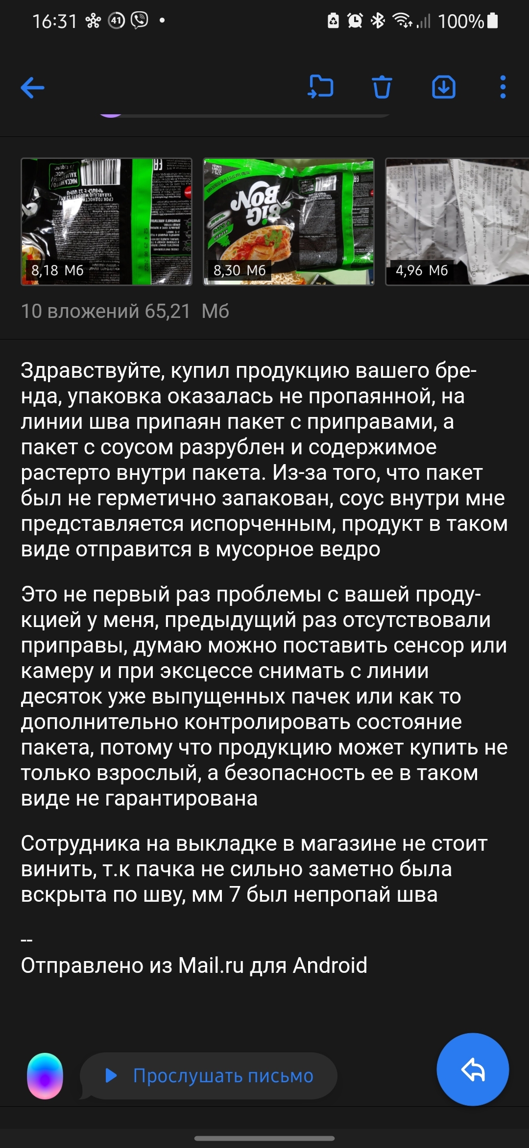 Совсем недавно купил несколько пачек бигбона у себя в городе, одна пачка оказалась не герметичной, без пакетика соуса, а часть его была размазана по пакету и лапше. Он за время хранения высох и испортился, хотя может уксус и специи не дали ему стать вредным, но я рисковать не стал, а выкинул. Написал чуть менее чем месяц назад им подробный емайл, приложил фото, дурачок, - они клали болт на потребителя, хотя бы извинились.