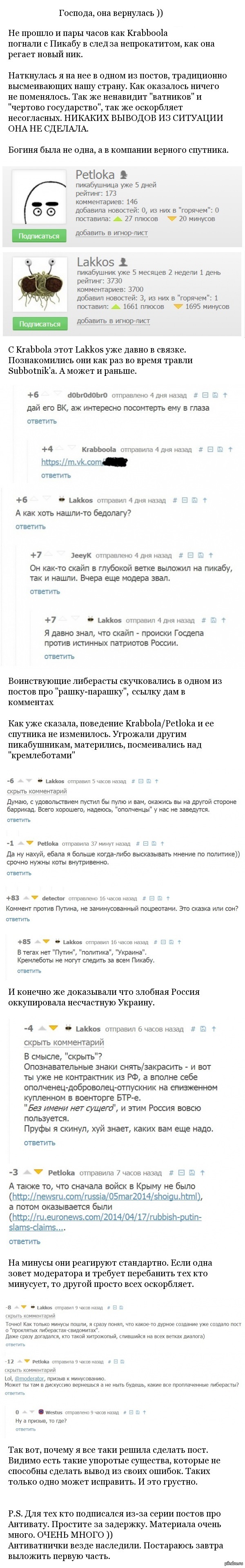 Вот пост где я их обнаружила http://pikabu.ru/story/kogda_smotrish_novosti_3020292 А вот тут Krabboola с нового аккаунта поучает одного из самых адекватных модераторов, в итоге скатываясь до оскорблений . Ничего не меняется...