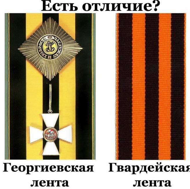 В общем не могу понять в чем разница, если только в стандартах Гвардейской: Ширина ленты — 32,5 мм, длина — 1420 мм. Ширина черных полос — 6 мм, ширина оранжевых просветов между ними — 6,25 мм, ширина выпушки — 1 мм.