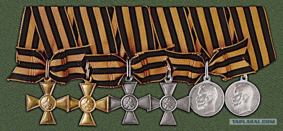 Теперь относительно Г. Креста, у вас на картинке изображен выцветший старинный баян первых серий. В реальности же Георгиевский Крест времен первой мировой был подвешен на ленту идентичную современным/советским. 1) Георгиевские Кресты Первой Мировой 2) Орден Славы (Солдатский Георгий" СССР эдишн) 3) Медаль "За Победу Над Германией" 4) Медаль "За Взятие Берлина" 5) Гвардейская Лента времен Царской России (!!!) 6) Гвардейская лента СССР/РФ (?)